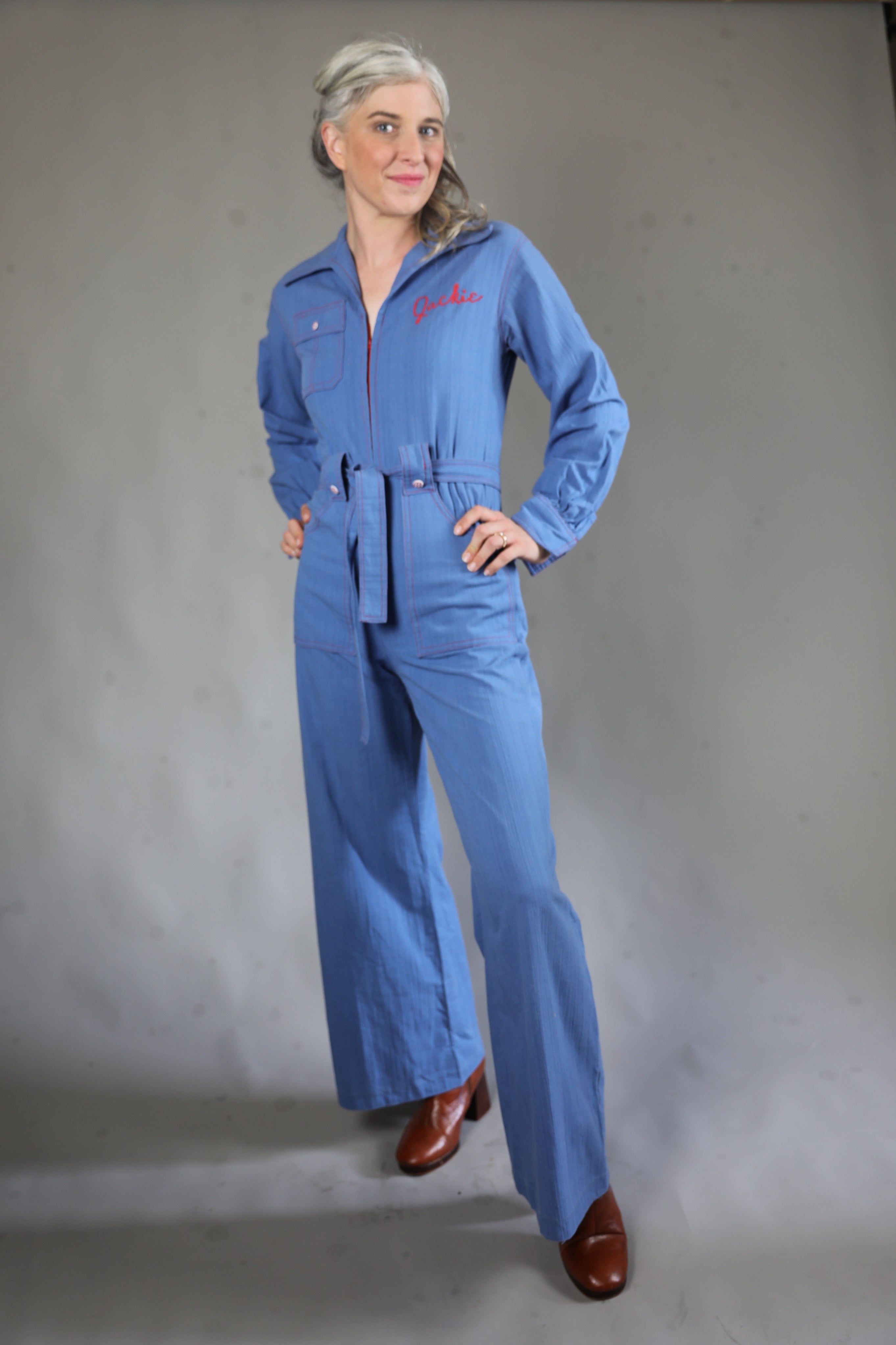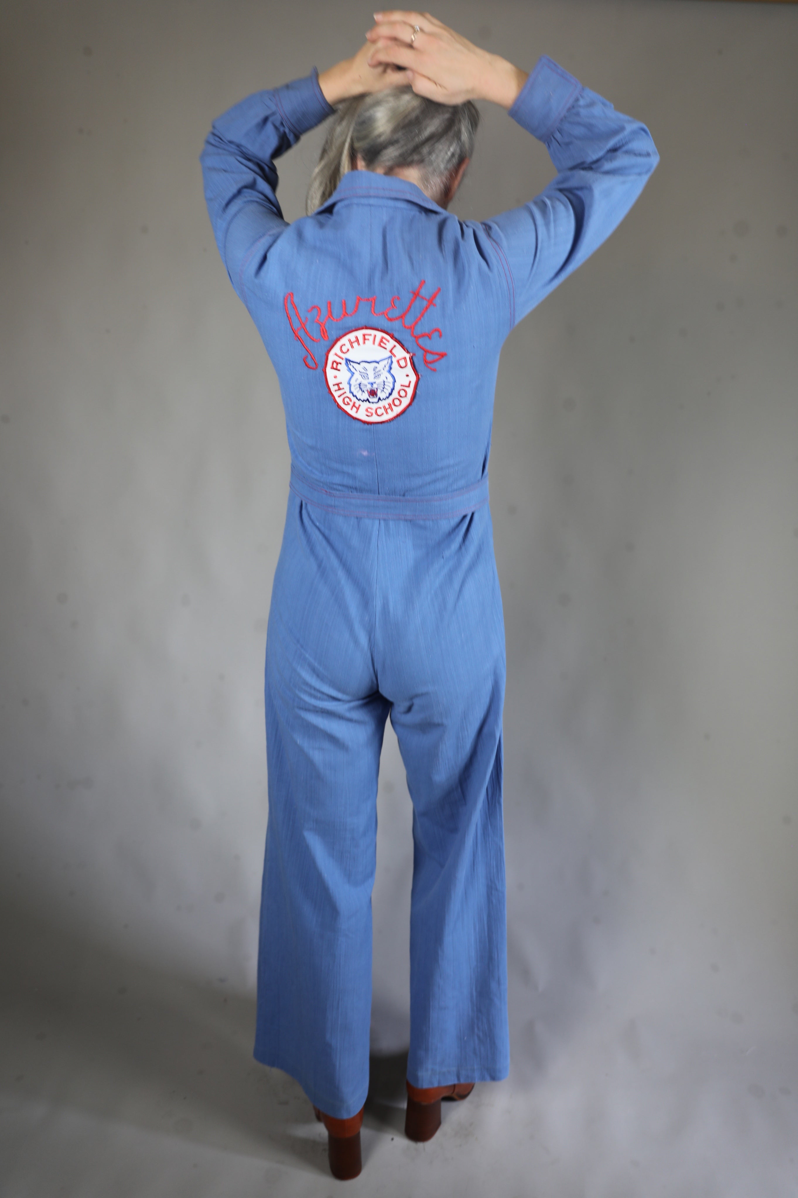 Richfield High School Azurettes drill team coverall jumpsuit, a rare 1970s Utah varsity relic with personalized chain-stitch embroidery, authentic Wildcat mascot patch, and authentic competition pedigree from the high-stepping champions.