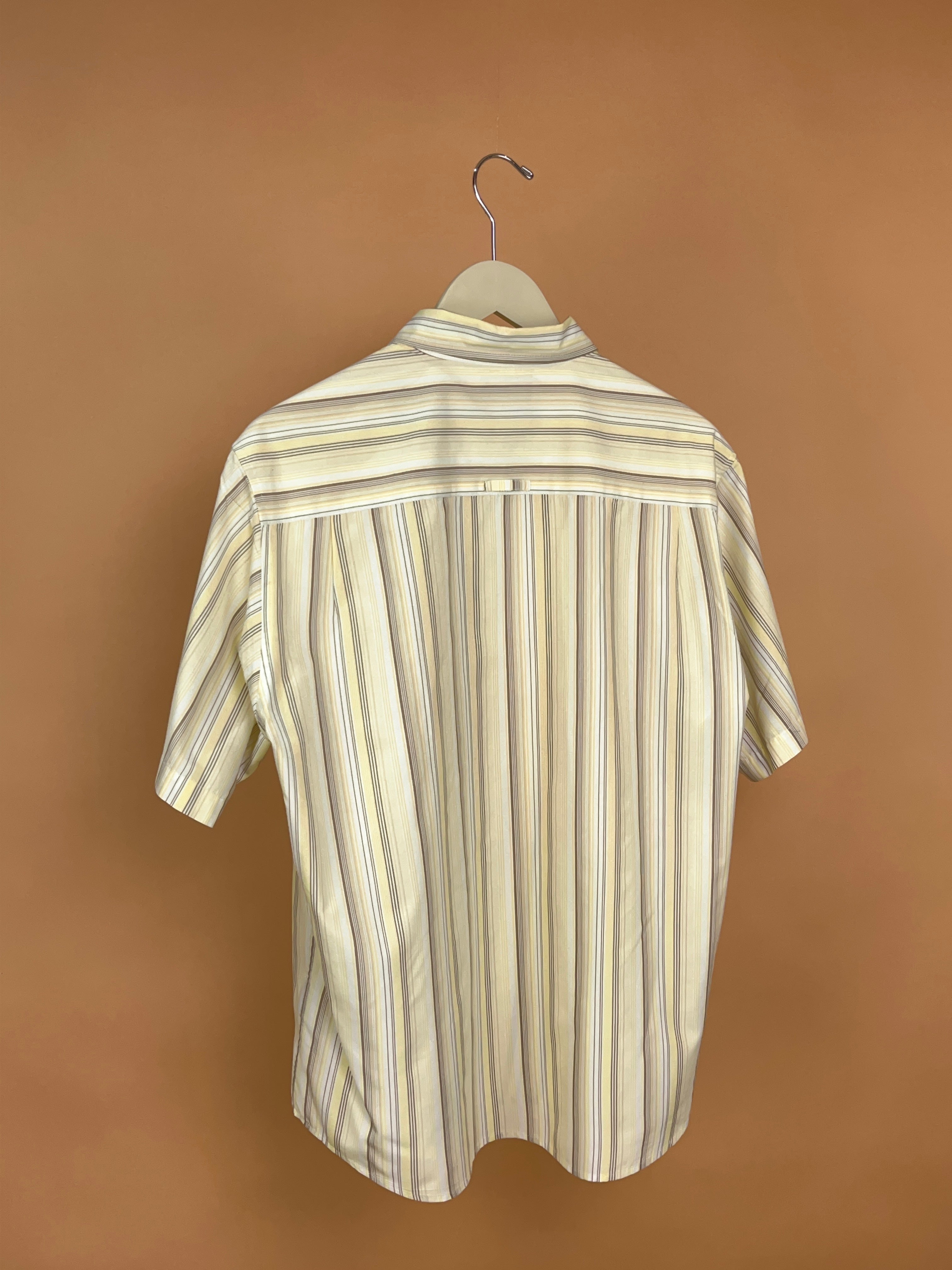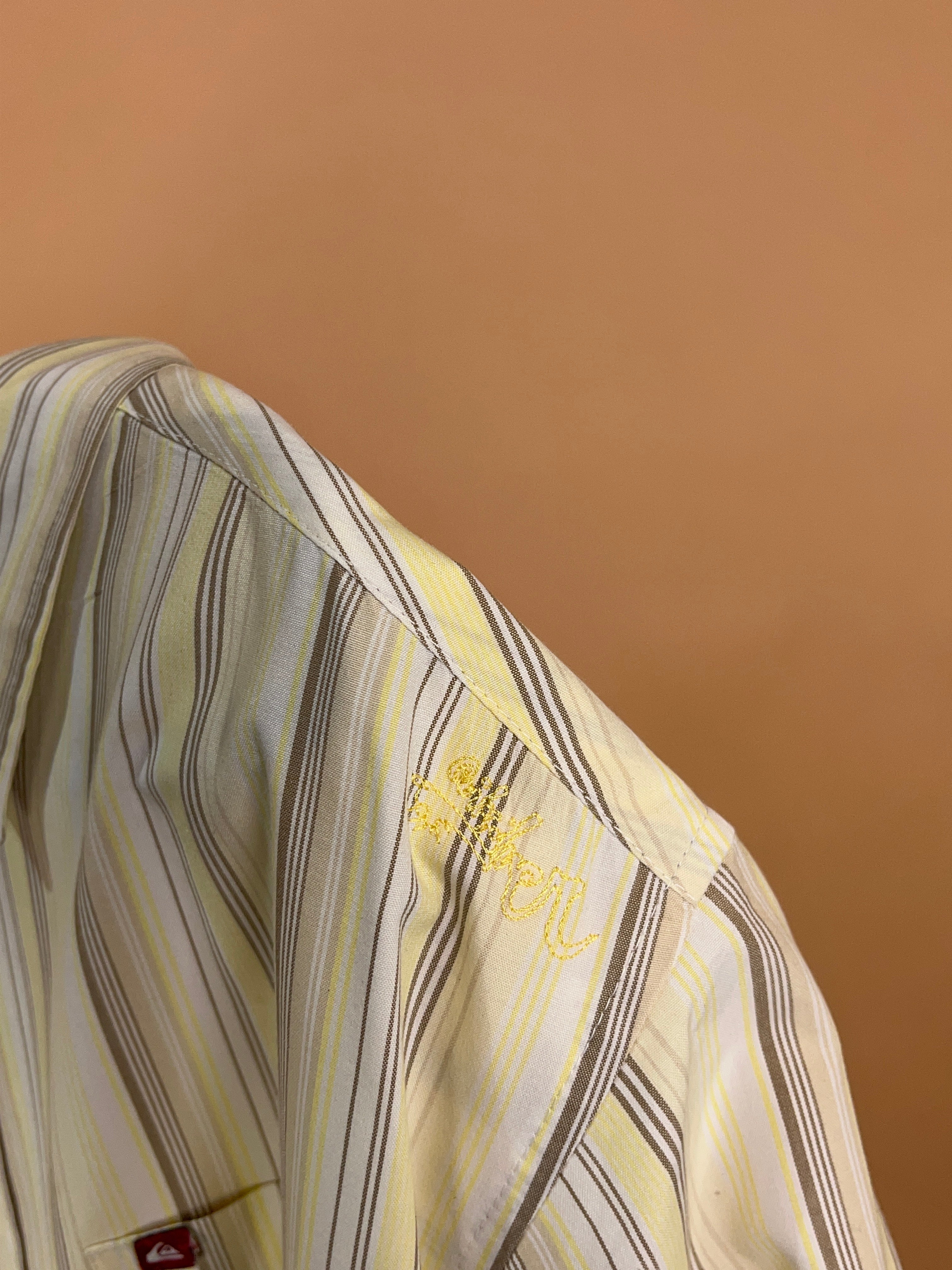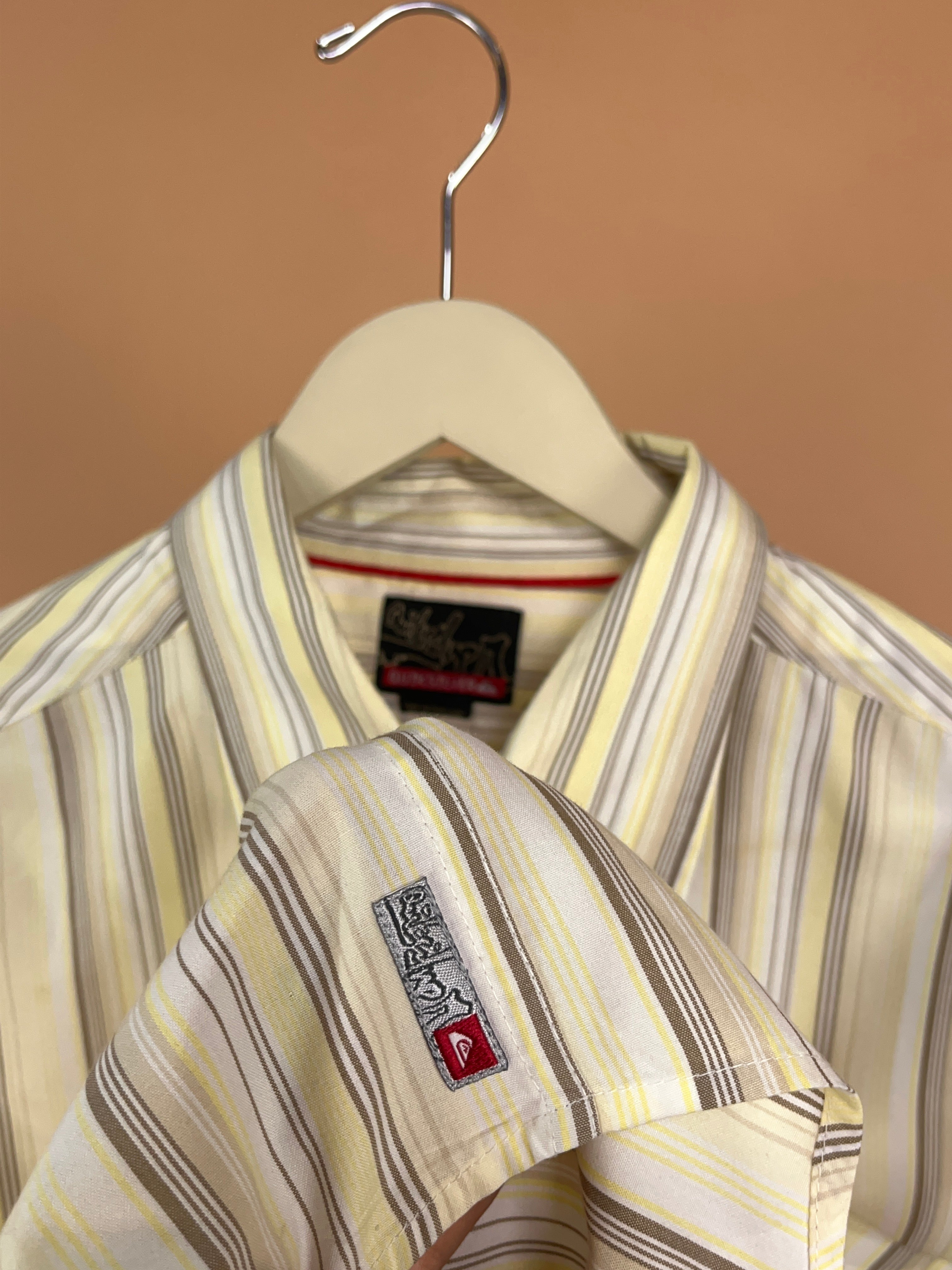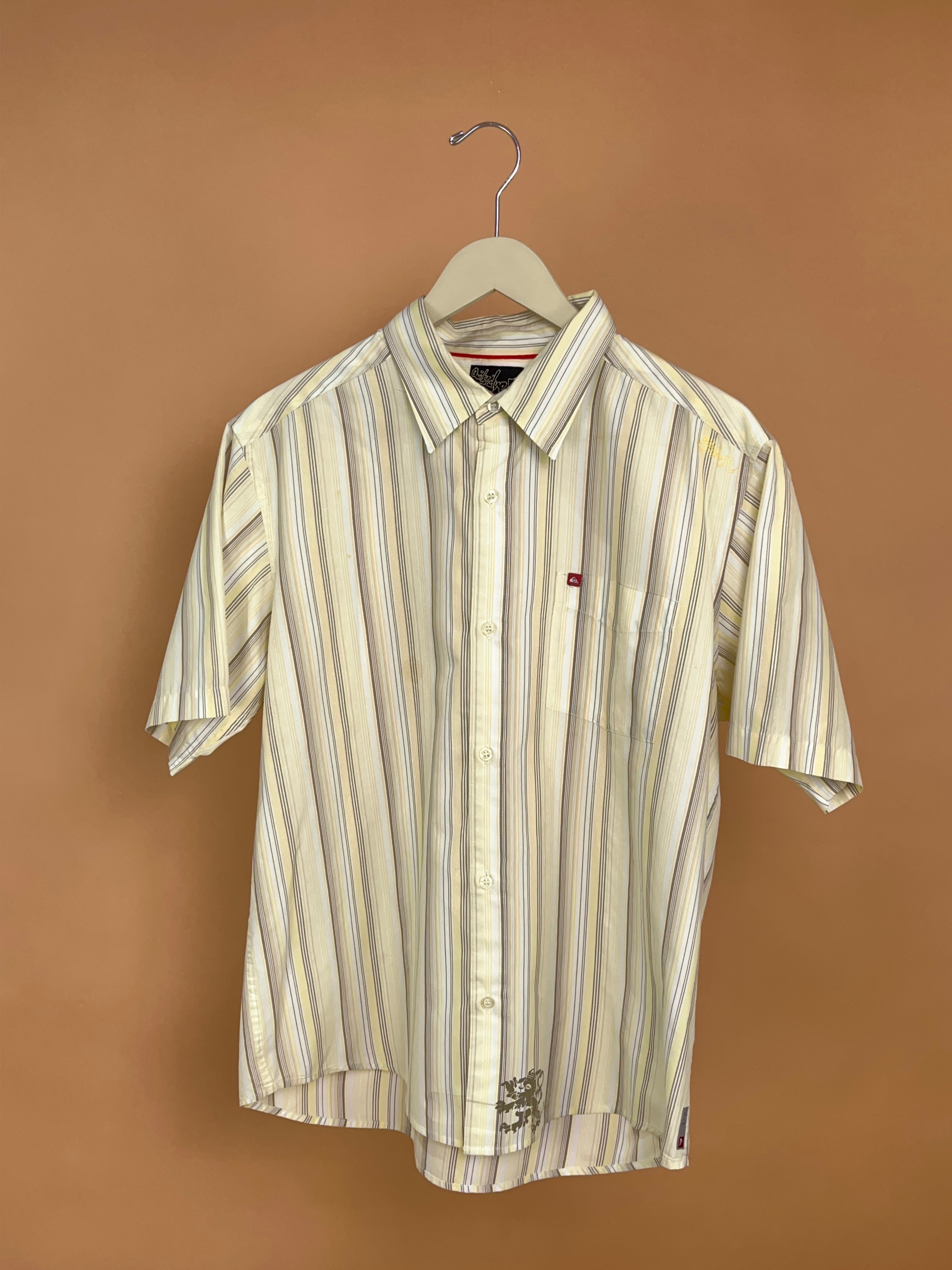 This 'Quicksilver' short sleeve shirt is in earthy tones of beige, taupe and pale yellow. It's reminiscent of a 1970's aesthetic with a retro surf feel. Would look fab paired back with some brown cords or simply layered up with a t-shirt underneath. It's in excellent vintage condition.