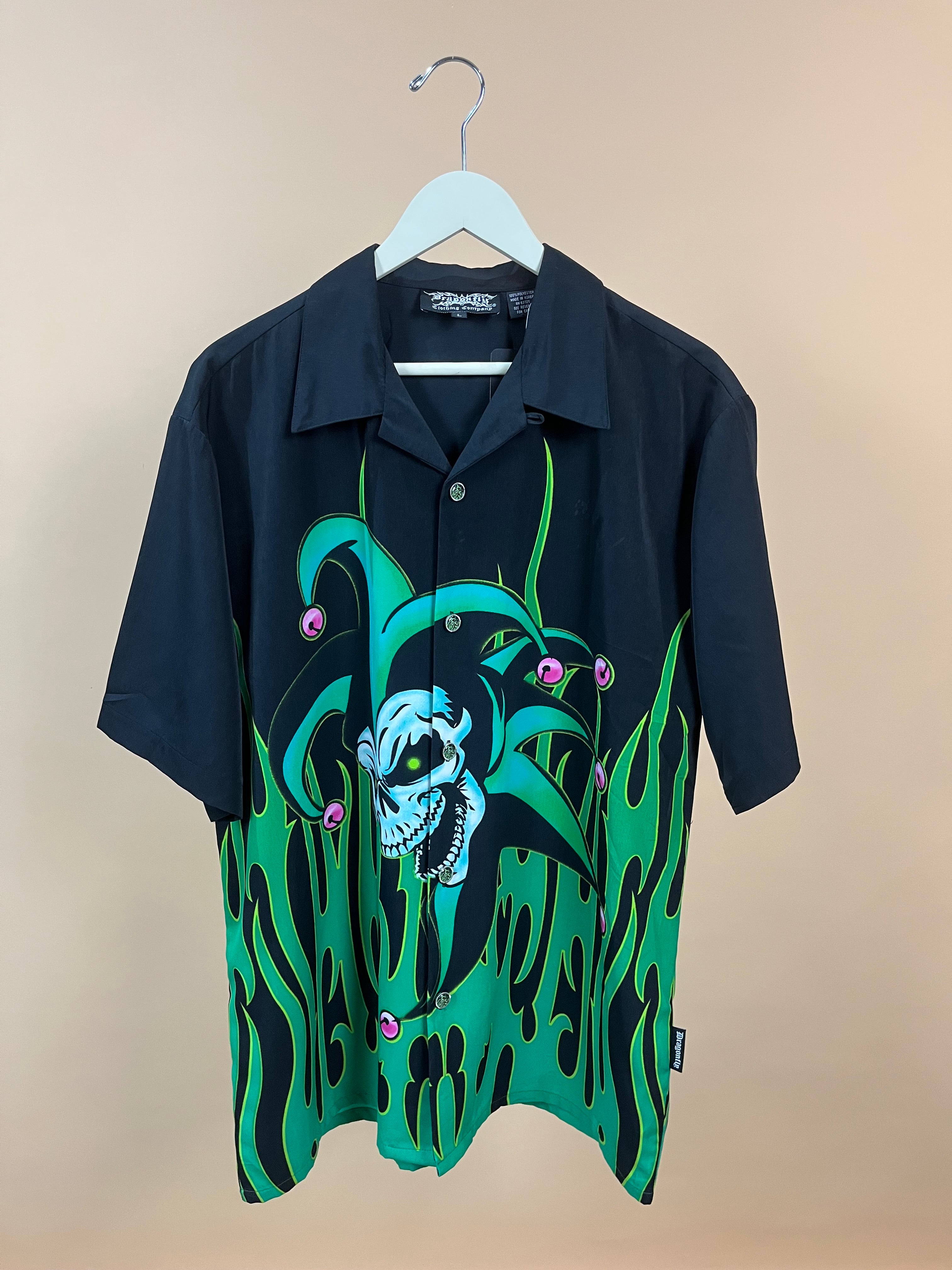 Y2K 'Dragonfly' Black & Green Jester Skull Flames Shirt