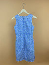 This vintage 1990's made in USA floral shift dress is in amazing condition. The sleeveless shift silhouette, crafted in a soft, floral jacquard fabric, showcases intricate lavender and periwinkle blue blooms scattered across a pastel field. It is fully lined with a UCAN metal zip closure in the middle of the back. The bottom hem has a beautiful frill.