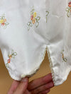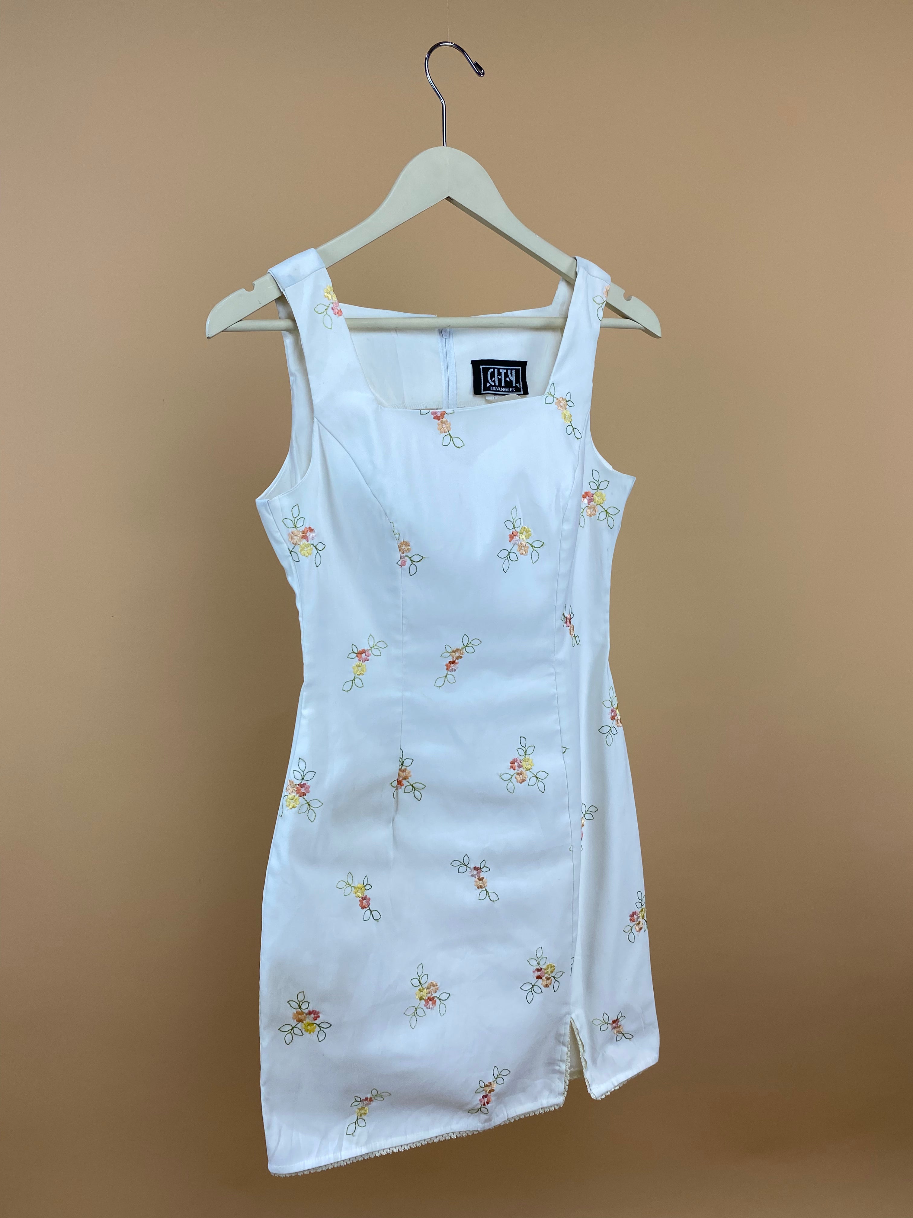 This vintage 1990's made in USA ivory floral shift dress is in great condition. It features a sleeveless cut in a crisp ivory hue, adorned with delicate floral embroidery throughout. It has a metal zipper closure in the back, and the hem features crochet lace edging. The tailored silhouette features a modern square neckline and subtle princess seaming, ensuring a flattering fit that gently skims the figure. Scattered clusters of petite blossoms in shades of coral, yellow, and green evoke a romantic, springtime charm.