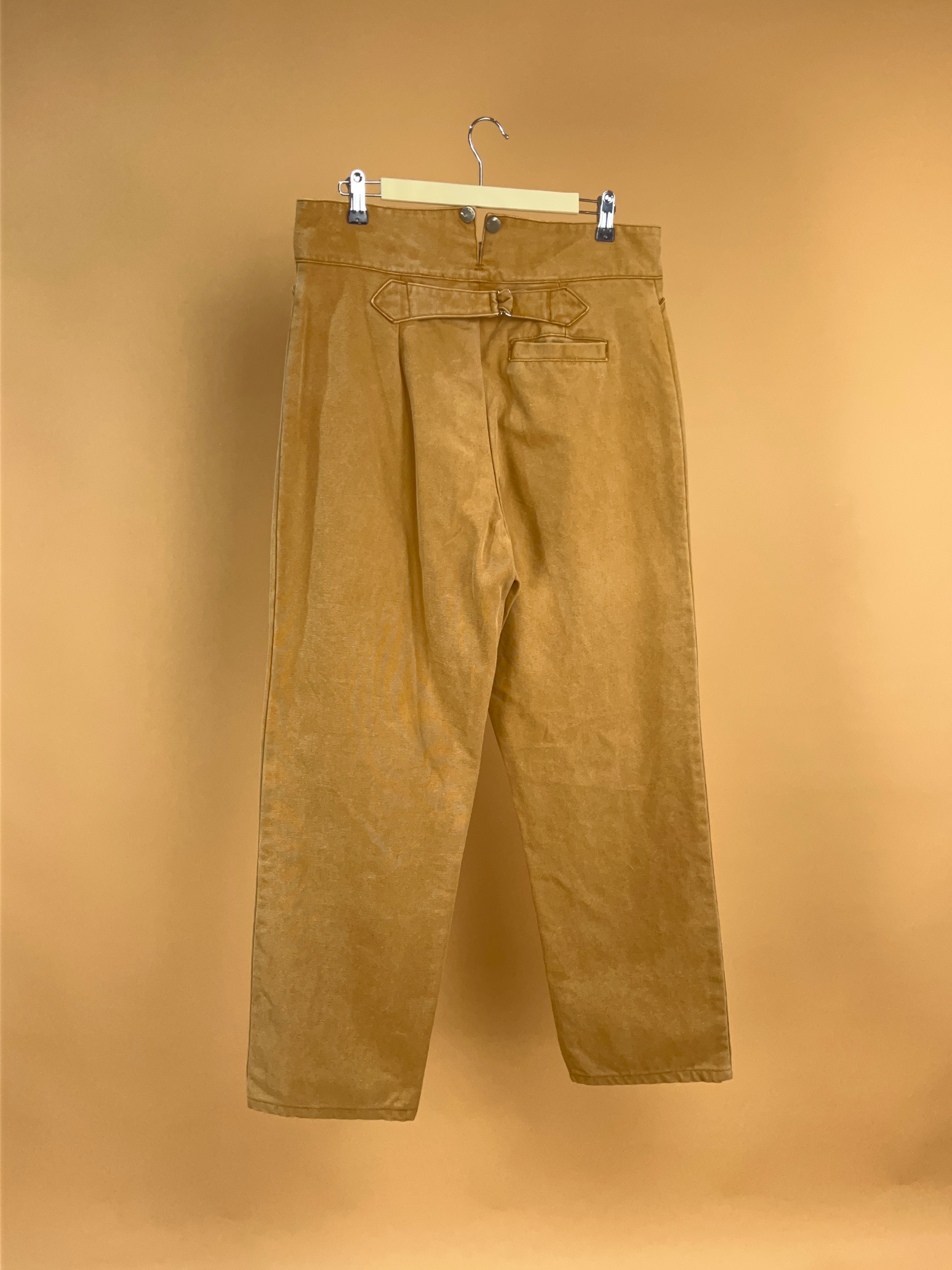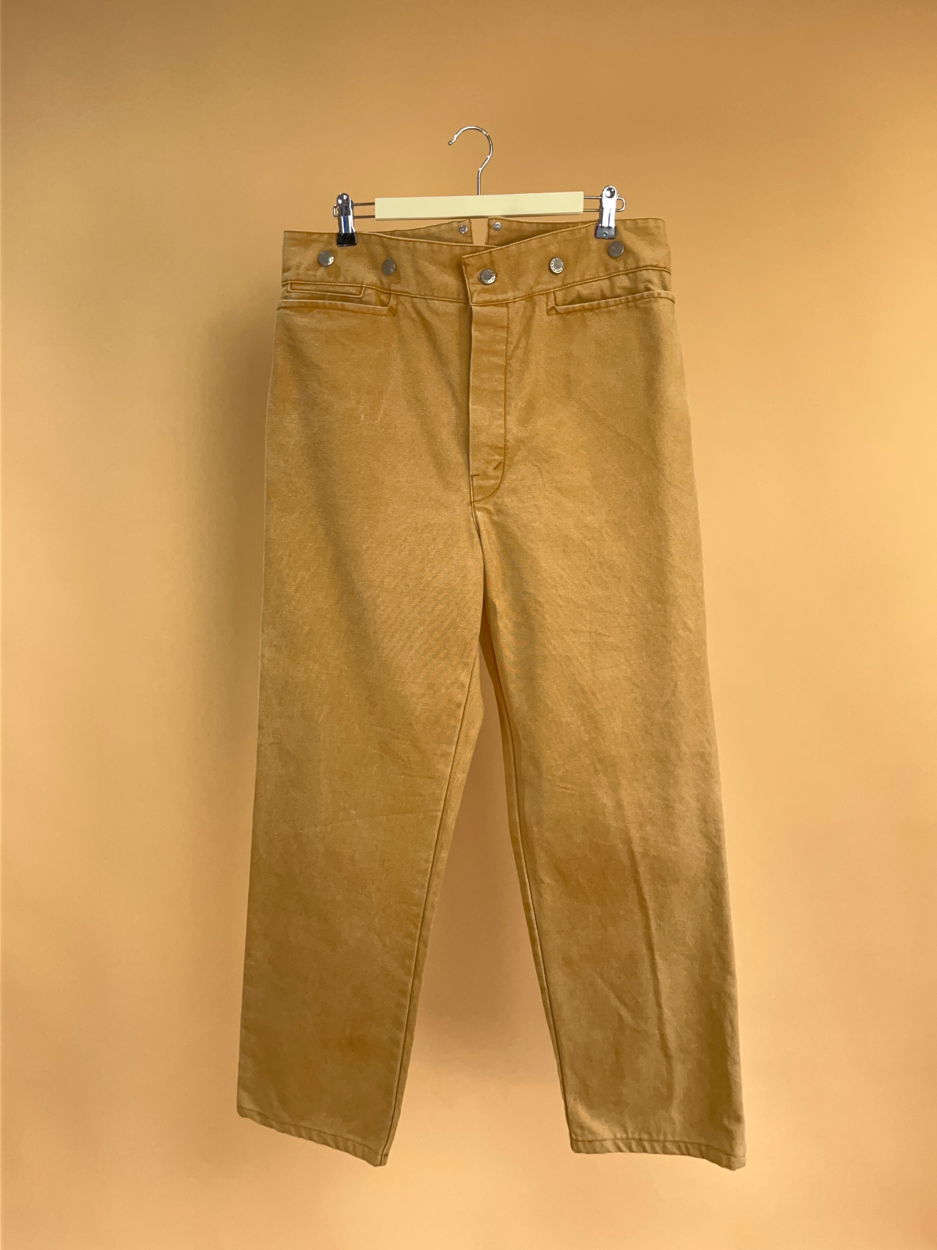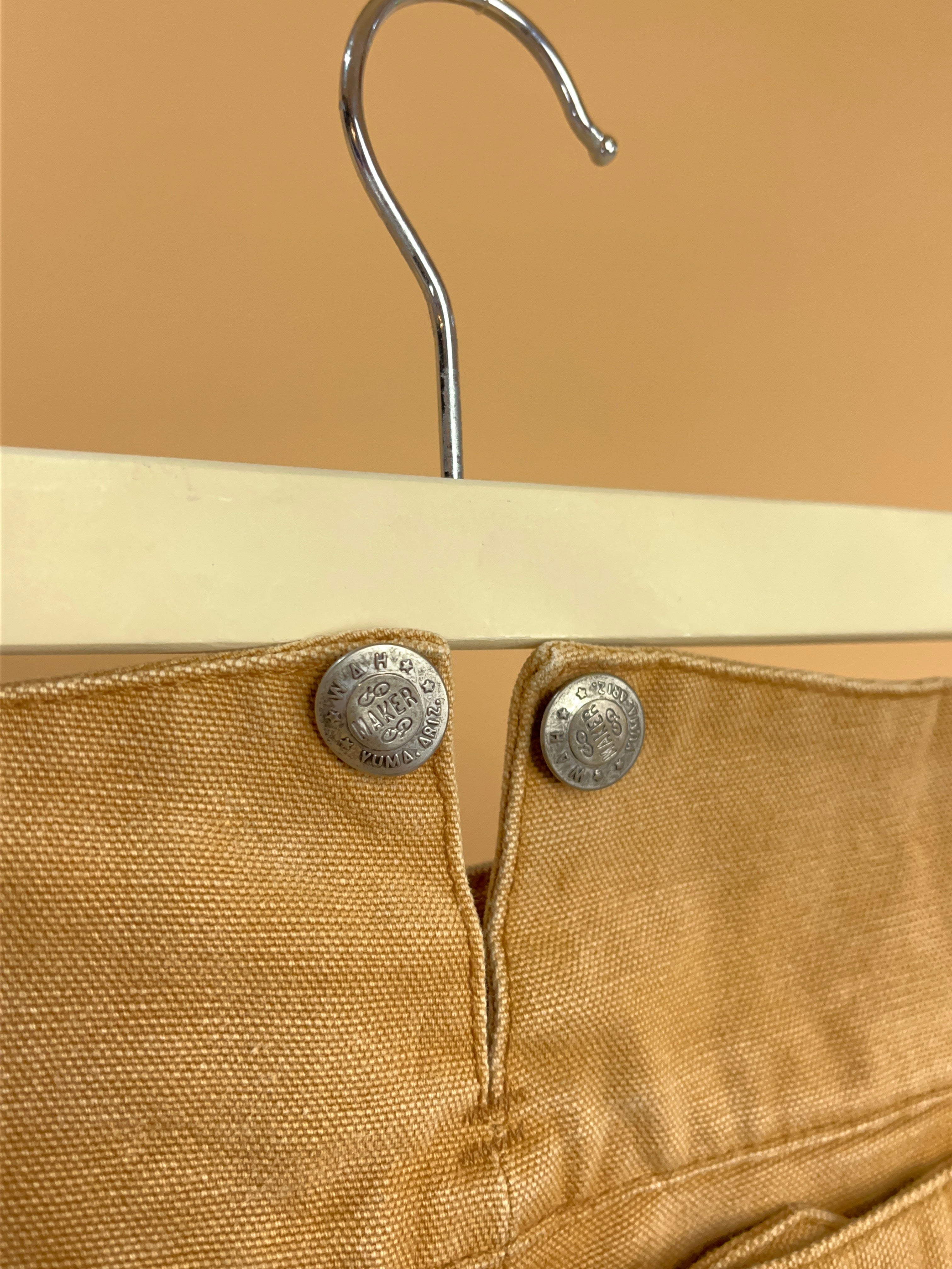 Wah Maker is a brand of authentic, vintage-style Western wear, historically noted for being produced in Yuma, Arizona, particularly during the 1990's. These 'Wah Maker' mustard jeans are in mint vintage condition. These jeans have a cinch back, multiple authentic metal suspender attachment buttons on the waist, and button up close.