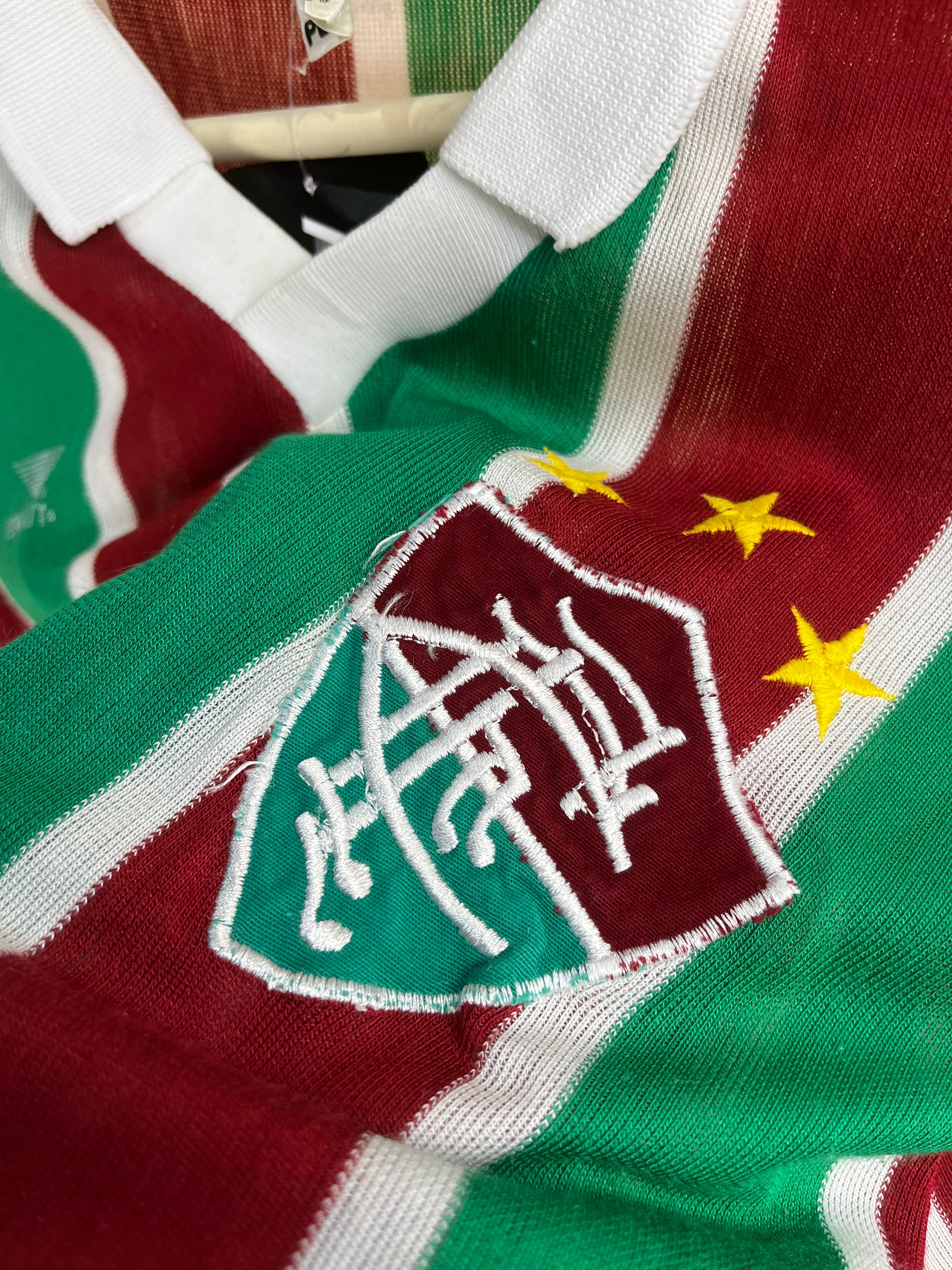 A vintage 1986 'Fluminese' Brazilian football club home jersey manufactured by Penalty, featuring the clubs classic maroon, green, and white vertical stripes with the Fluminese crest and three stars above it. Rare and collectable.