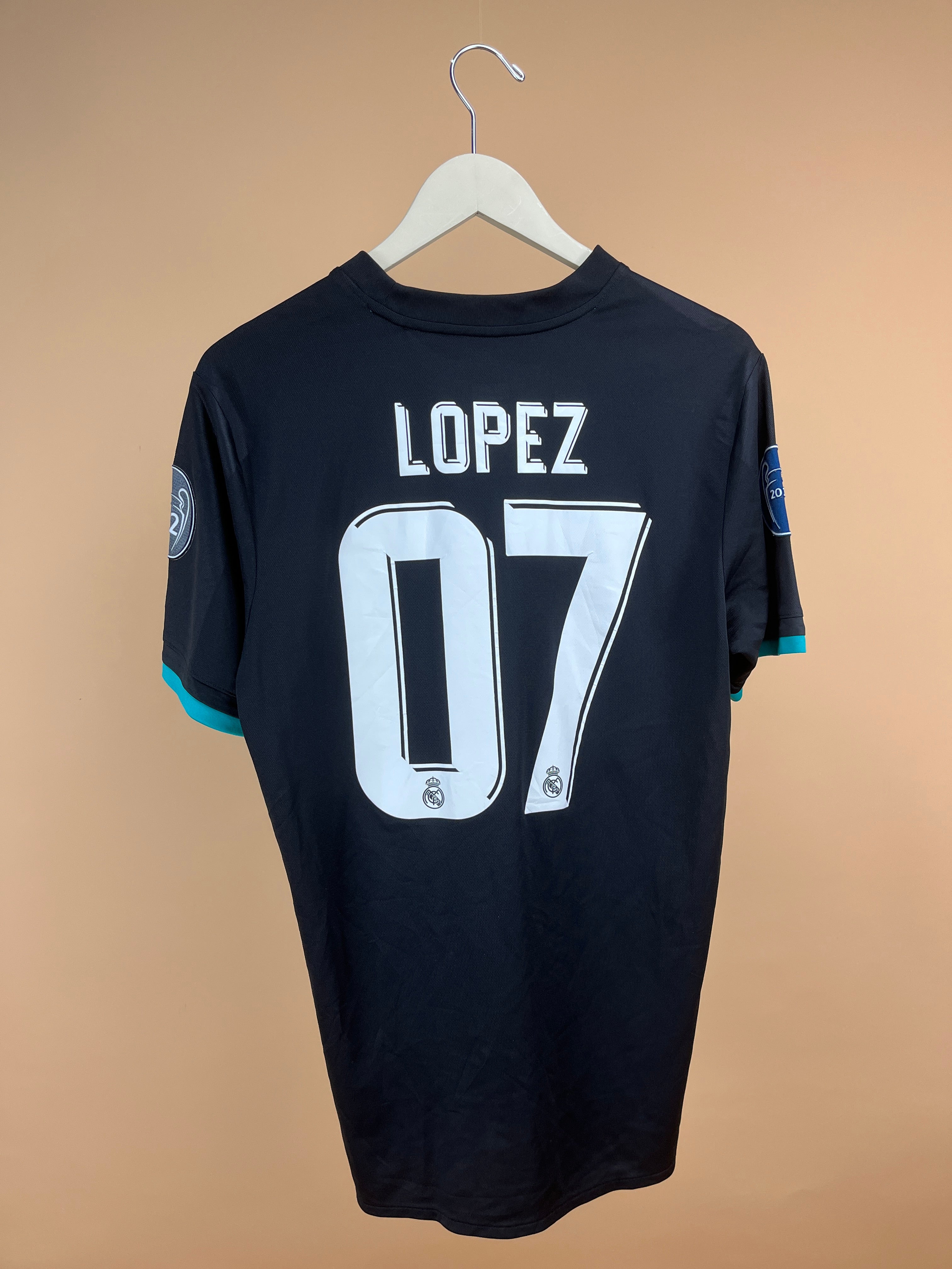This Adidas fan jersey with the name Lopes and number 07 from Real Madrid away kit from the 2017-18 season. The black base color with "Aero Reef" turquoise trim is a standout style choice from that year, complemented by the FIFA World Champions 2016 badge, which celebrates Real Madrid's Club World Cup victory. The “Fly Emirates” sponsor was featured prominently on Real Madrid kits during that era.