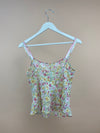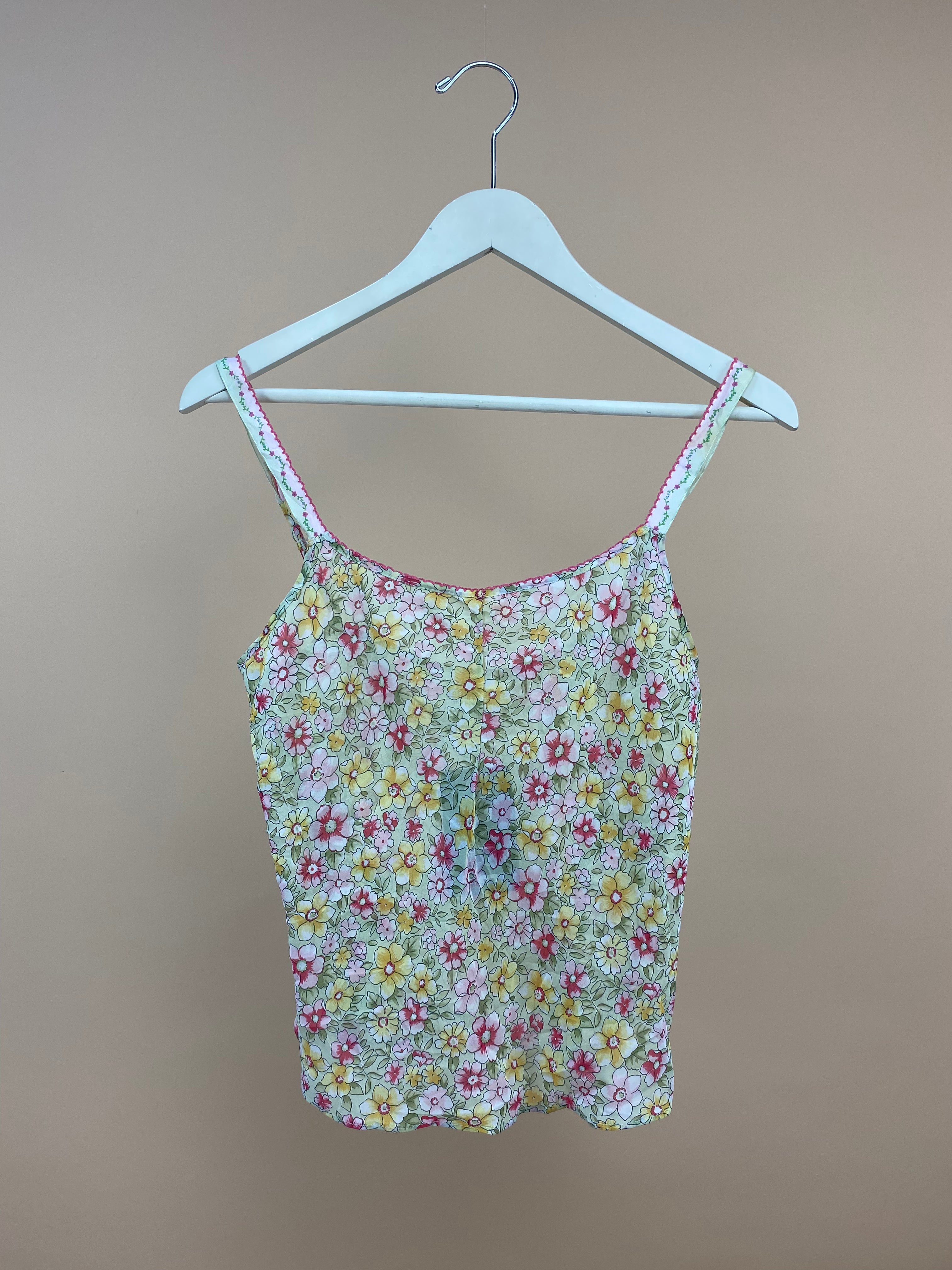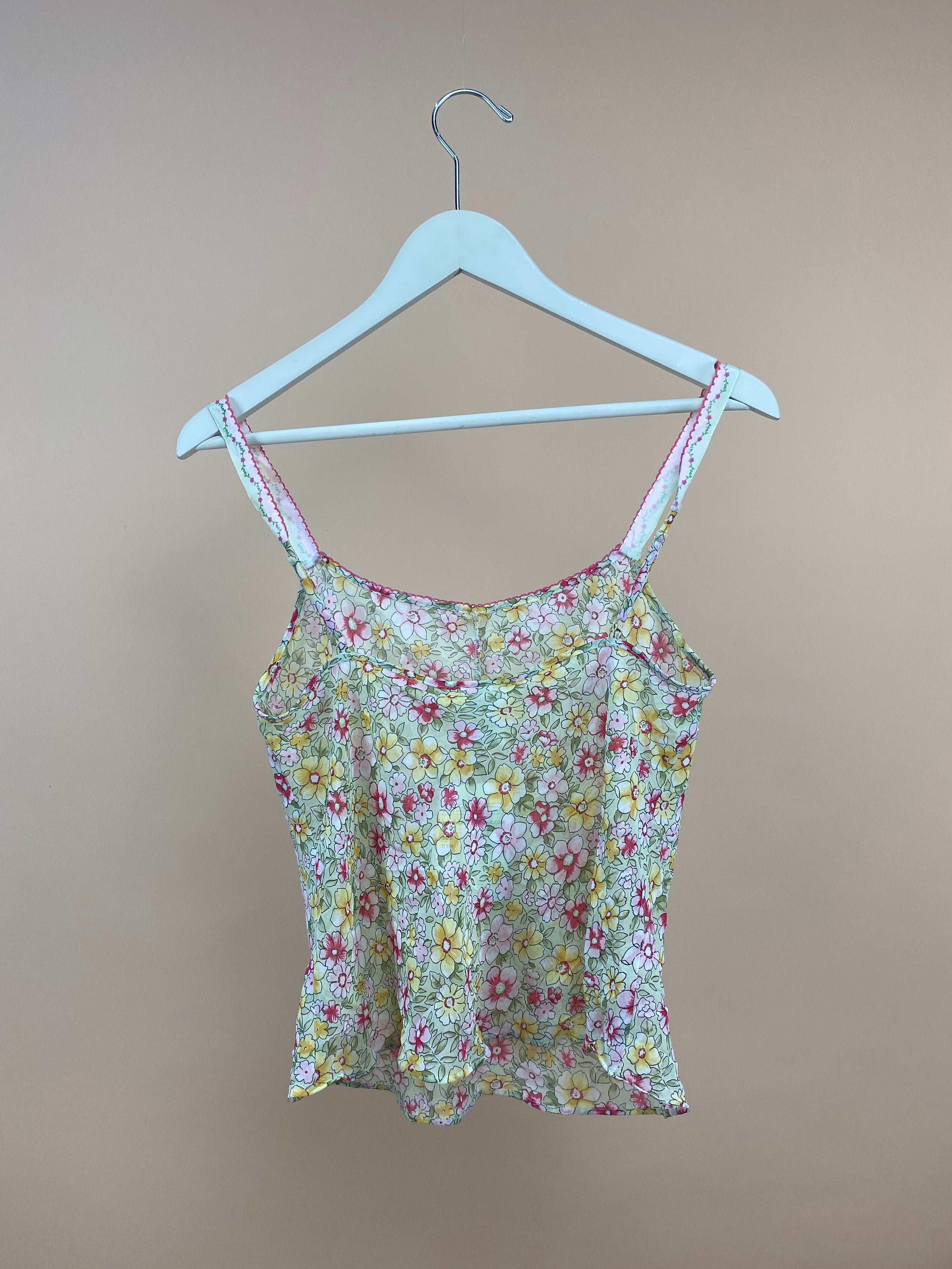 This floral vintage cami is in great condition. It has a delicate and colourful pattern featuring small flowers in yellow, pink, and orange. It has thin adjustable straps with decorative edging and a lightweight, sheer fabric.