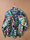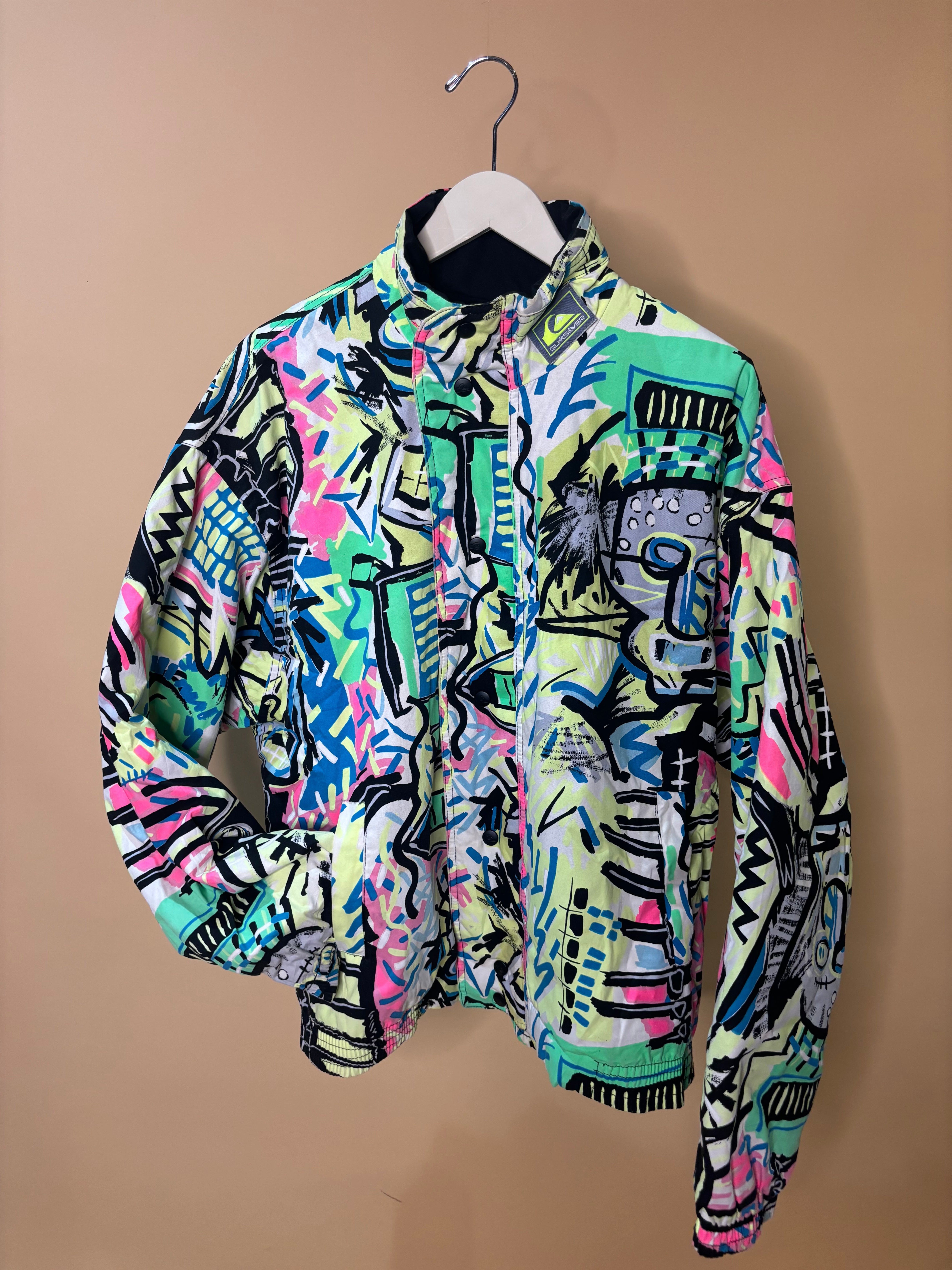 This is an outstanding piece of surf fashion... an oversized, original 1980's padded bomber jacket with classic neon abstract design, reminiscent of that decade. It has a chunky, vintage Talon zip opening with popper snap buttons which are embossed with the Quicksilver logo. It has an elasticated waistband, two slanted external pockets and an internal pocket on the inside left chest. It has a chunky stand up collar with neon Quicksilver label.