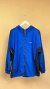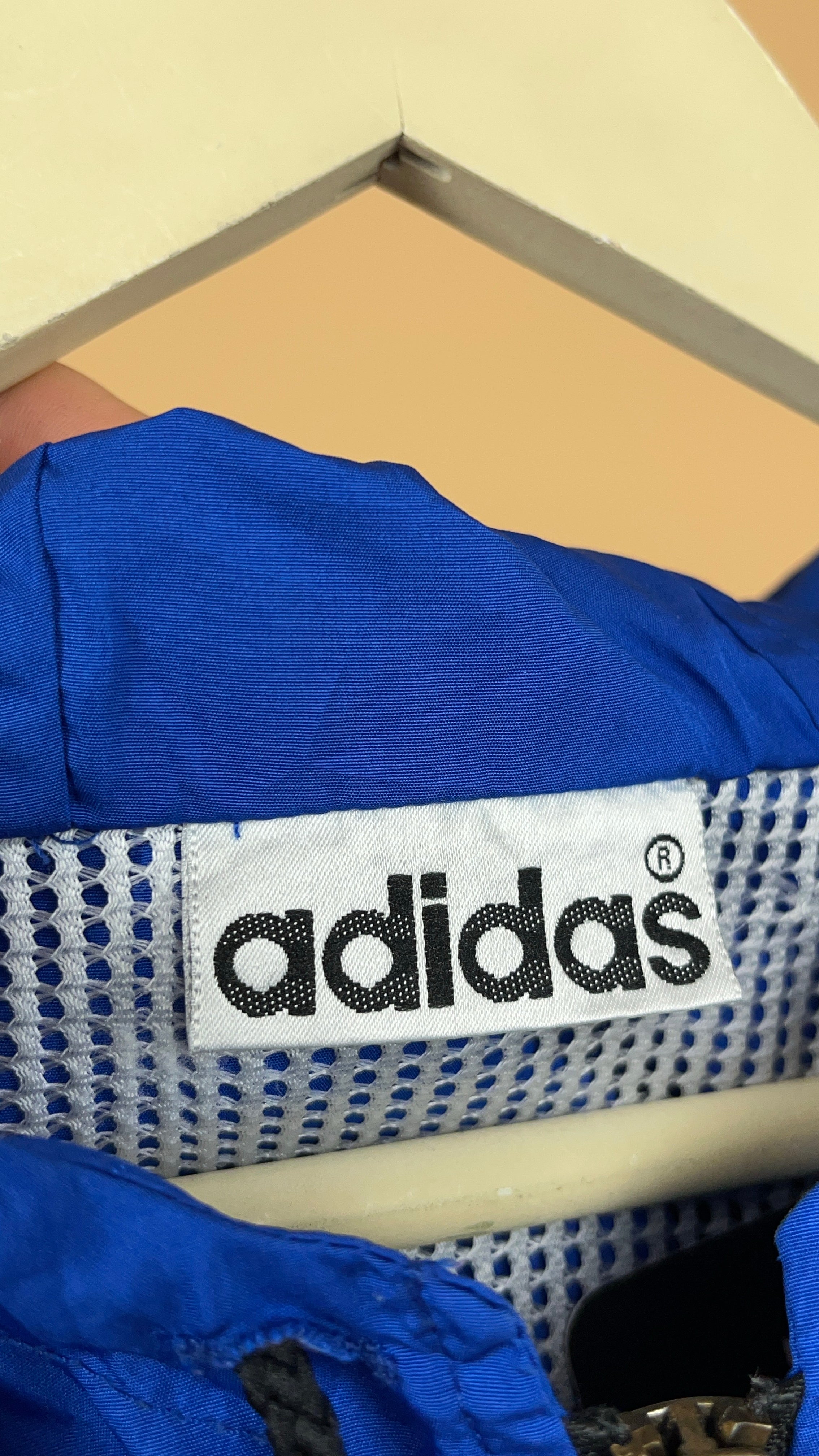 This electric blue & black 'Adidas' windbreaker is in amazing condition. It has a full zipper front, open welt pockets on the side, and elasticated waist and cuffs.