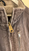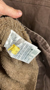 This is a mint condition vintage 'Carhartt' rugged washed brown work gilet. It has a heavy duty canvas shell with a distressed finish, warm sherpa lining, and a sturdy front zip closure with signature 'Carhartt' metal zipper. It has a chest zip pocket, large front kangaroo pockets and the iconic 'Carhartt' logo patch on the left pocket.