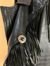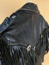 This amazing 1980's perfecto fringed leather biker jacket is in amazing mint vintage condition. It has an asymmetrical front zip, skull cross metal buttons, structured silhouette, with a strong shoulder line and a cropped length that emphasizes a boxy, masculine profile. It has a black leather fringe, which cascades diagonally from the yoke and shoulders down the front panels and continues along the back and vertical pockets. The inside lining is quilted.