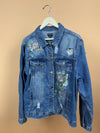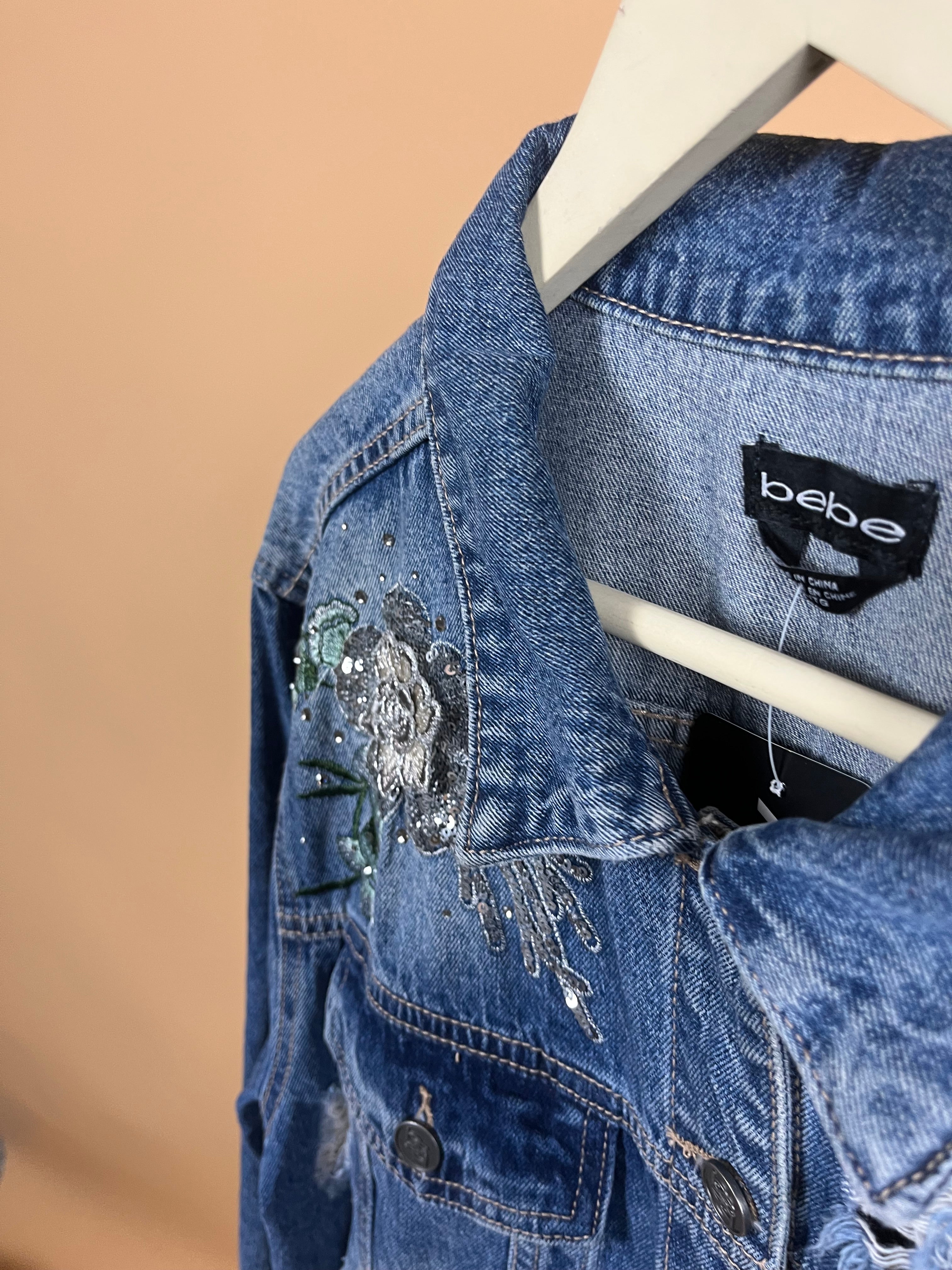 This excellent condition Y2K "Bebe" denim jacket is adorned with sparkling sequin floral appliqués and subtle distressed details for an effortlessly chic look. Romantic floral embellishments are placed across the shoulder and side, lending a touch of glam to classic blue denim. The jacket features traditional button closures, dual functional chest and side panel pockets, and gentle fraying for that perfectly worn-in feel.