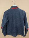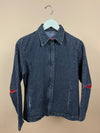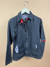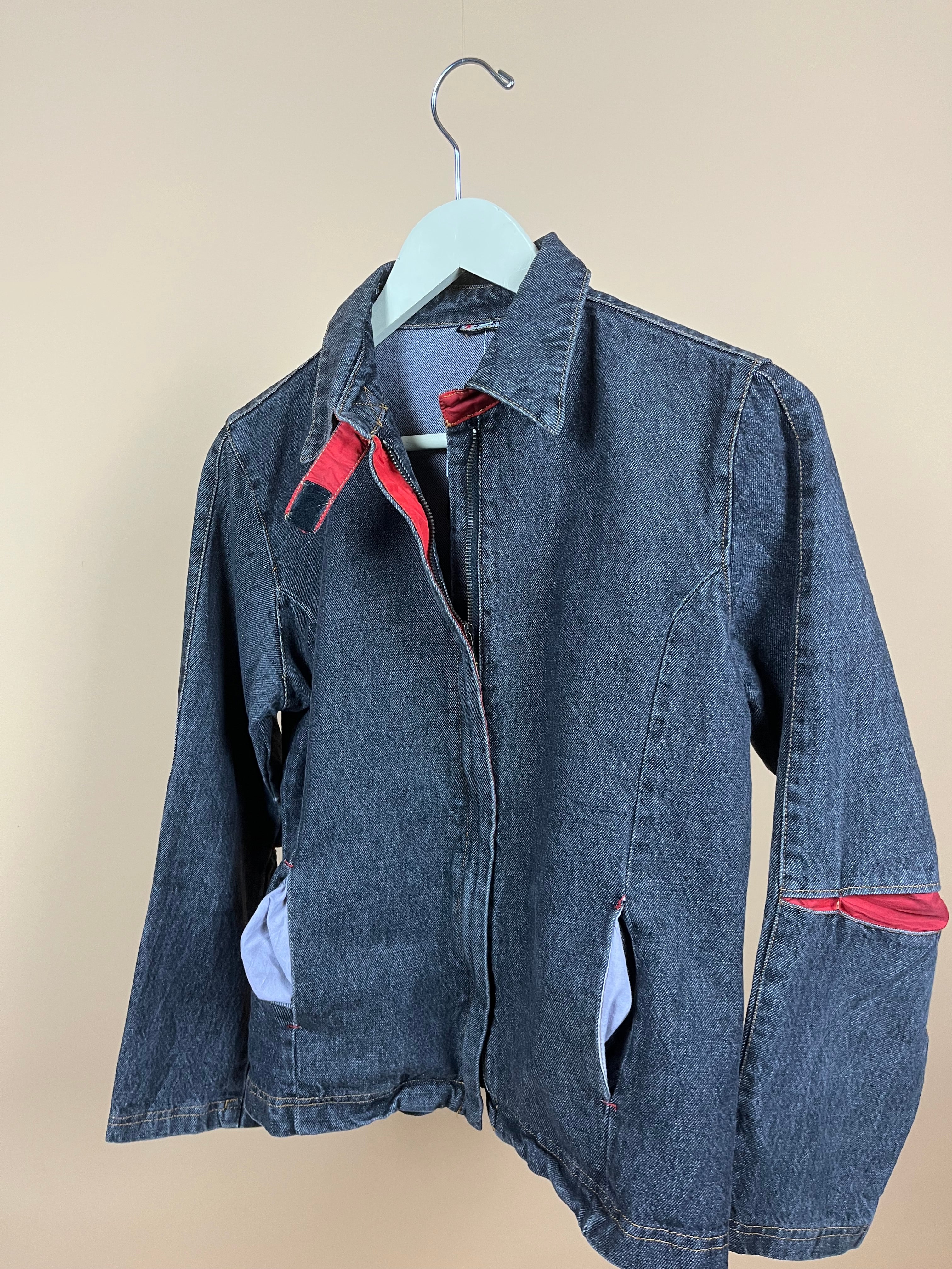 This quality Y2K dark-washed denim jacket features a fabric strip under the structured collar and vibrant red lining peeking through the inner arm and pocket edges. It has vertical, angled front pockets and a quality zipper that is subtly integrated into the jacket's front. It has clean, minimalist lines and precise tailoring for a modern silhouette.