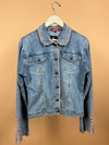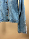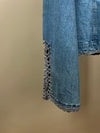 This Y2K light wash denim jacket features stunning intricate crochet trim along the collar, button placket, cuffs, and hem. The jacket offers a classic fitted silhouette with chest flap pockets and metal button closures, blending a timeless denim look with unique handcrafted details for added flair.