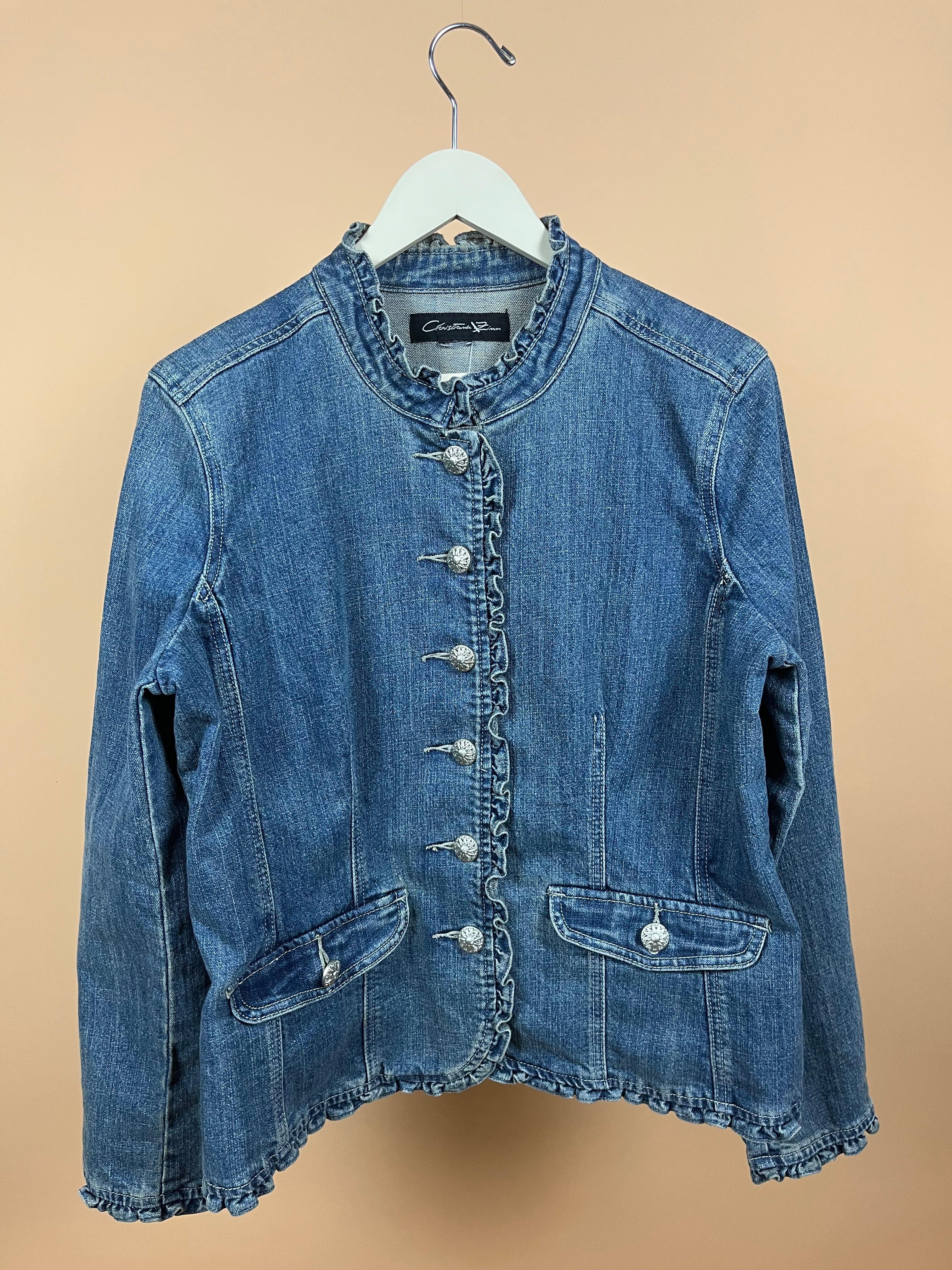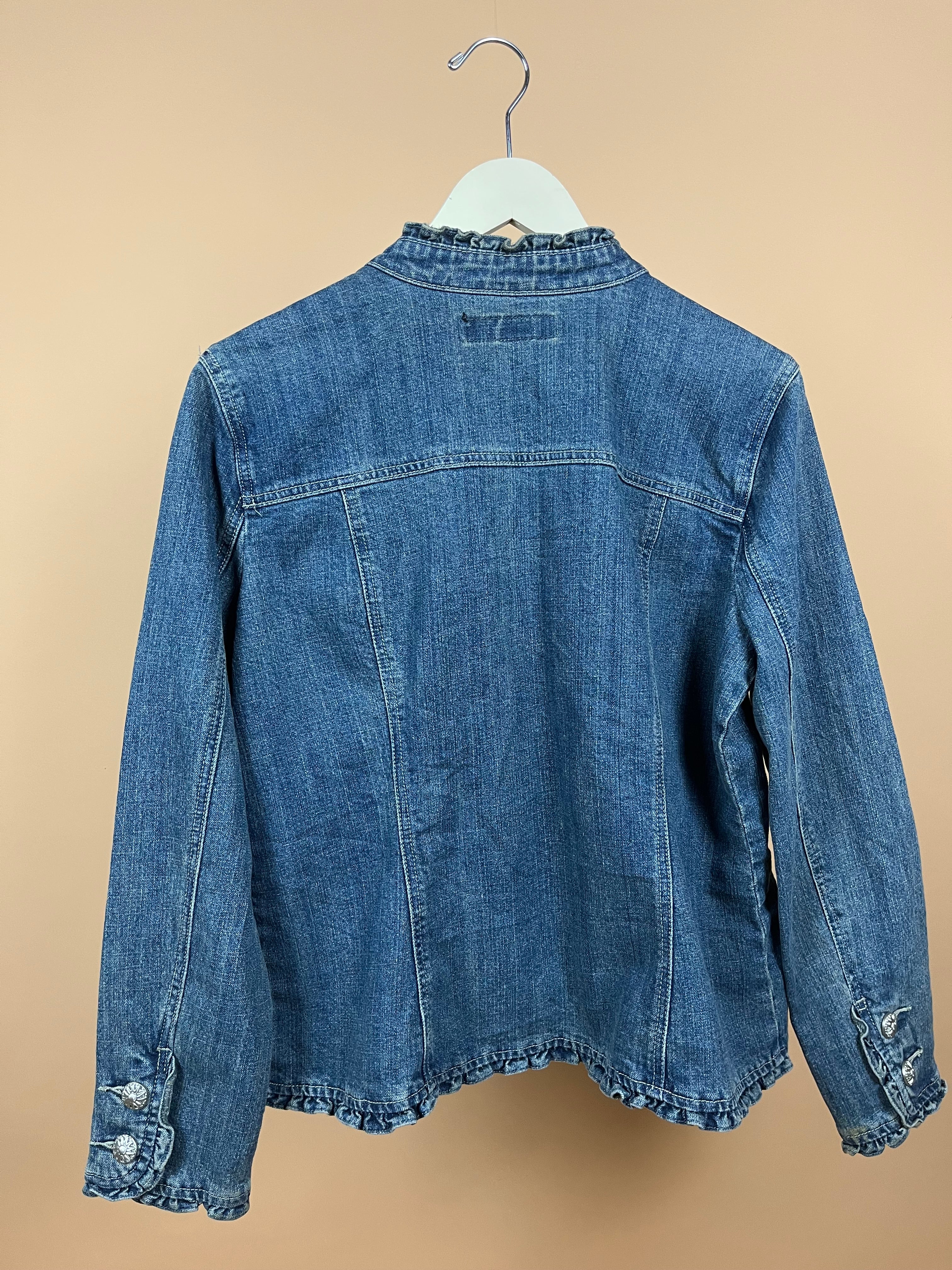 This quality Y2K denim jacket has classic tailoring with a feminine twist. It features elegant ruffle detailing along the collar, placket, and hem. The signature metallic buttons, embossed with intricate motifs, offer a unique finish. The structured silhouette is subtly cinched for a flattering shape, while flap-closure pockets and decorative buttoned cuffs add practical sophistication.