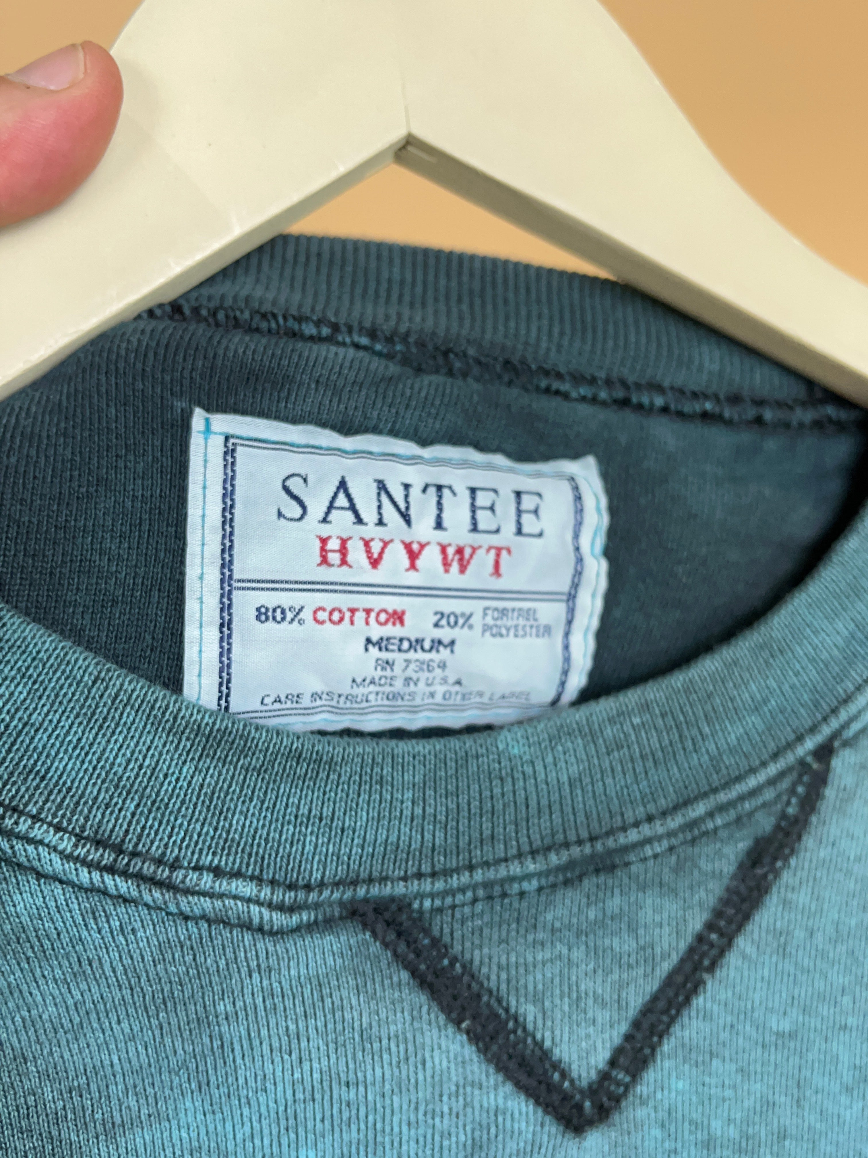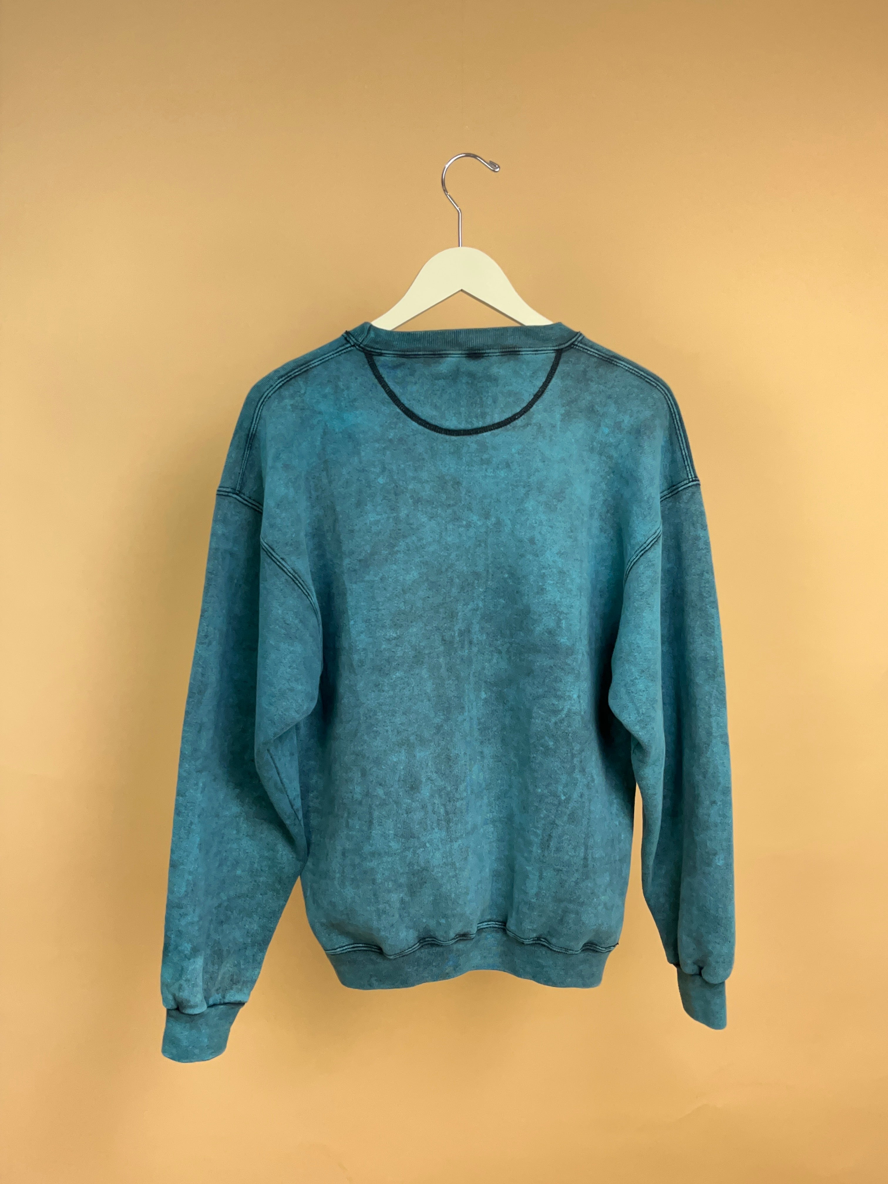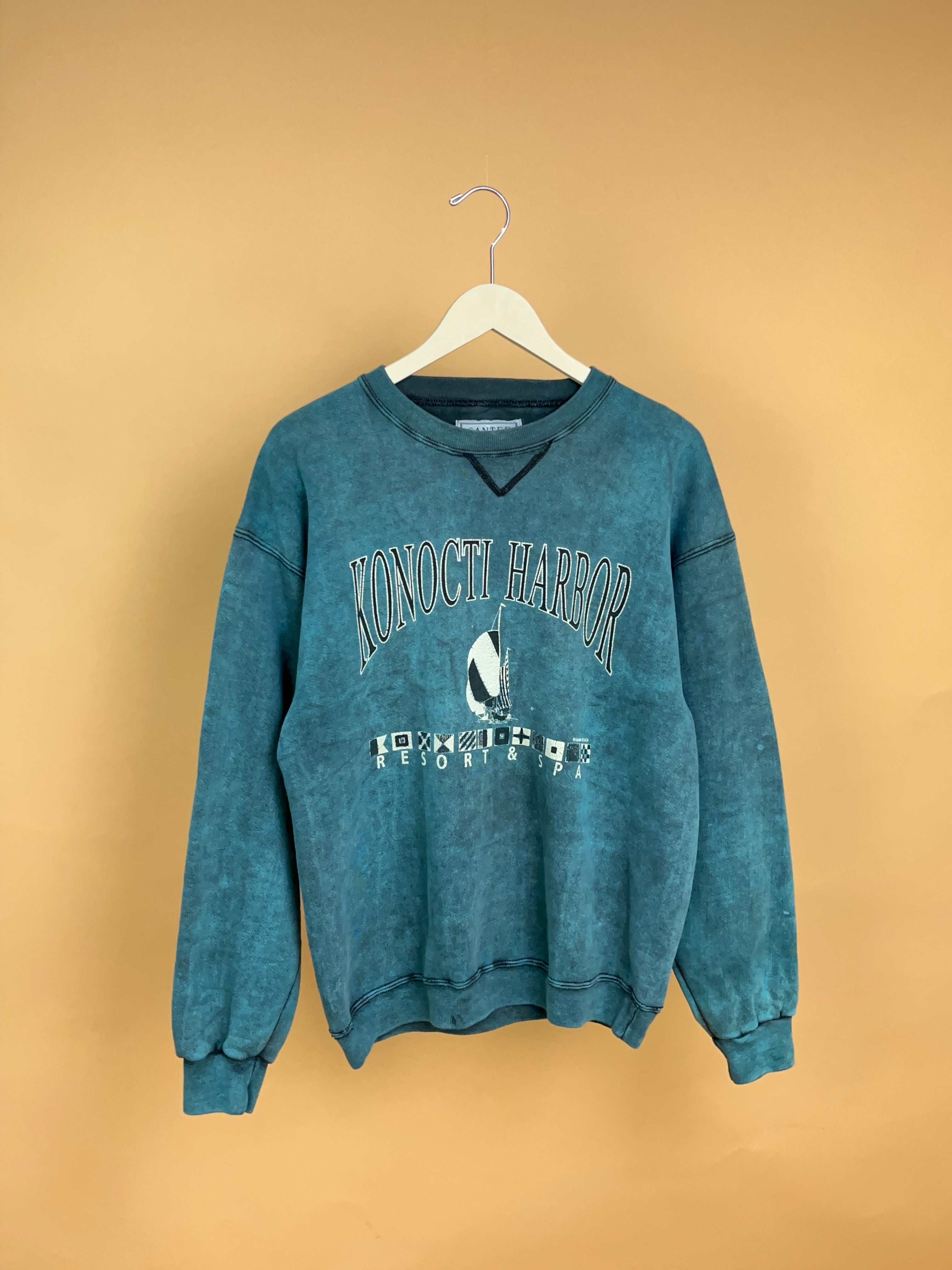 This Vintage 1990s heavyweight Konocti Harbor Resort & Spa sweatshirt in a perfectly sun-faded teal, featuring cracked sailboat front graphic. Made on a Santee Heavyweight tag, this classic crew has a relaxed slouchy fit, ribbed cuffs/hem and that soft, worn-in handle you only get with true vintage. Ideal styled with denim or bike shorts for an easy coastal-off-duty look.