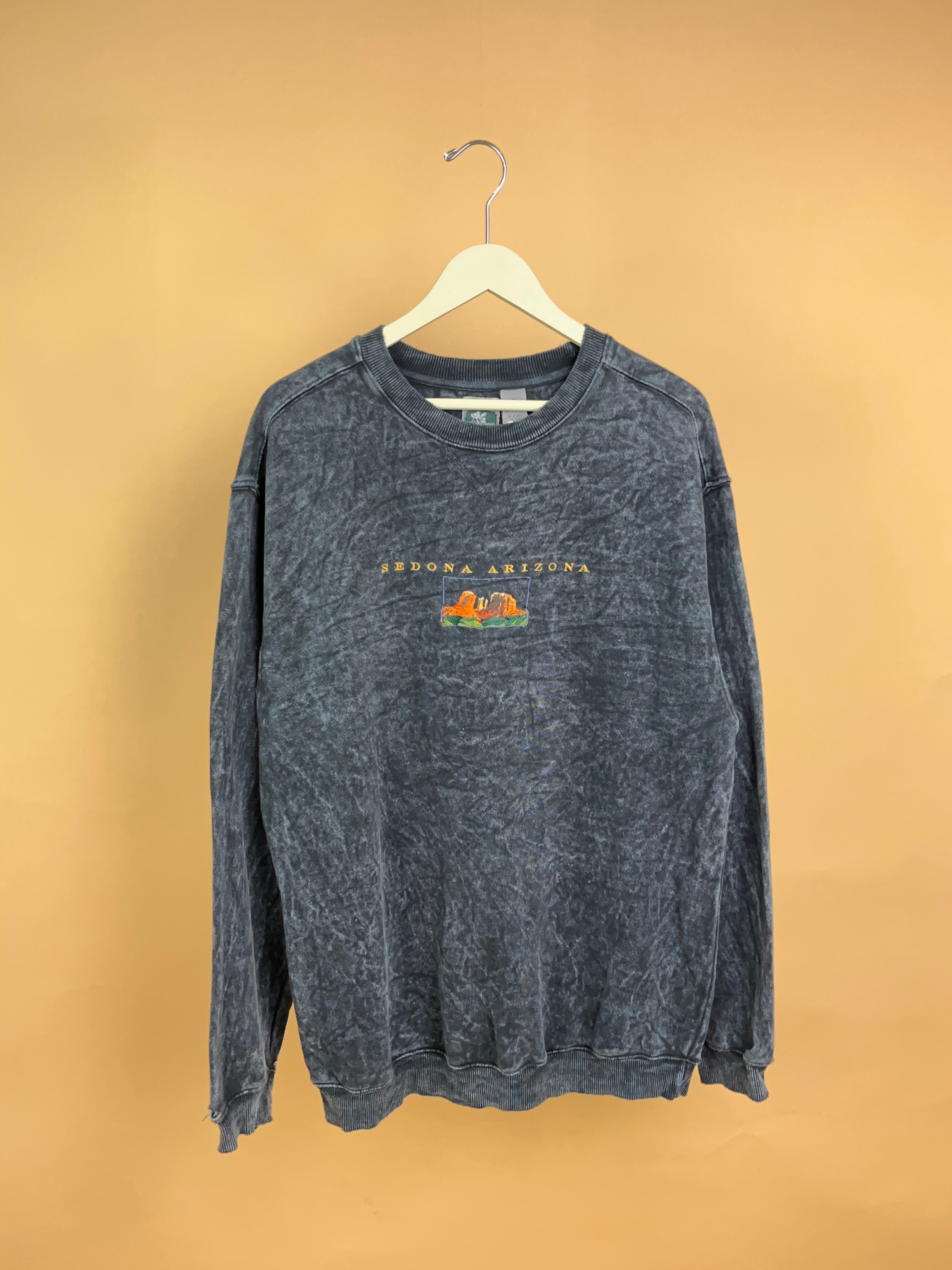 This authentic vintage 'McIntosh & Seymour' Sedona, Arizona crewneck sweatshirt featuring a beautifully detailed embroidered red rock landscape across the chest is in good condition. The desert scene pops in warm tones of rust, orange and sage against a perfectly faded charcoal acid-wash base.