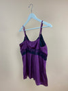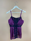 This Y2K deep plum cami is in great condition. it has intricate black lace panels along the bust, waist, and centre front. Soft gathers add gentle drape and volume and delicate covered buttons down the front. With adjustable spaghetti straps and a luxe, fluid handfeel, this piece blends boudoir romance with refined evening style