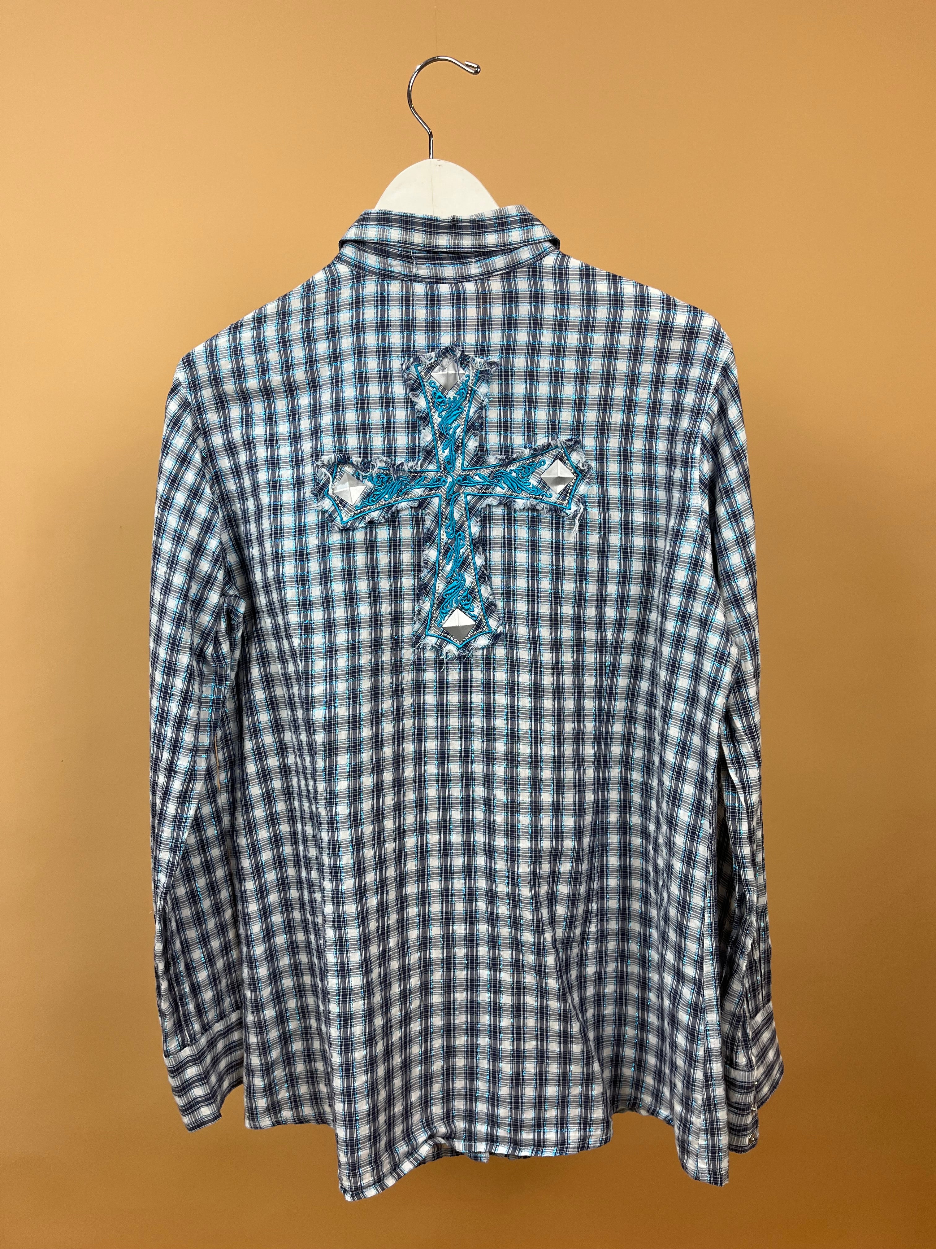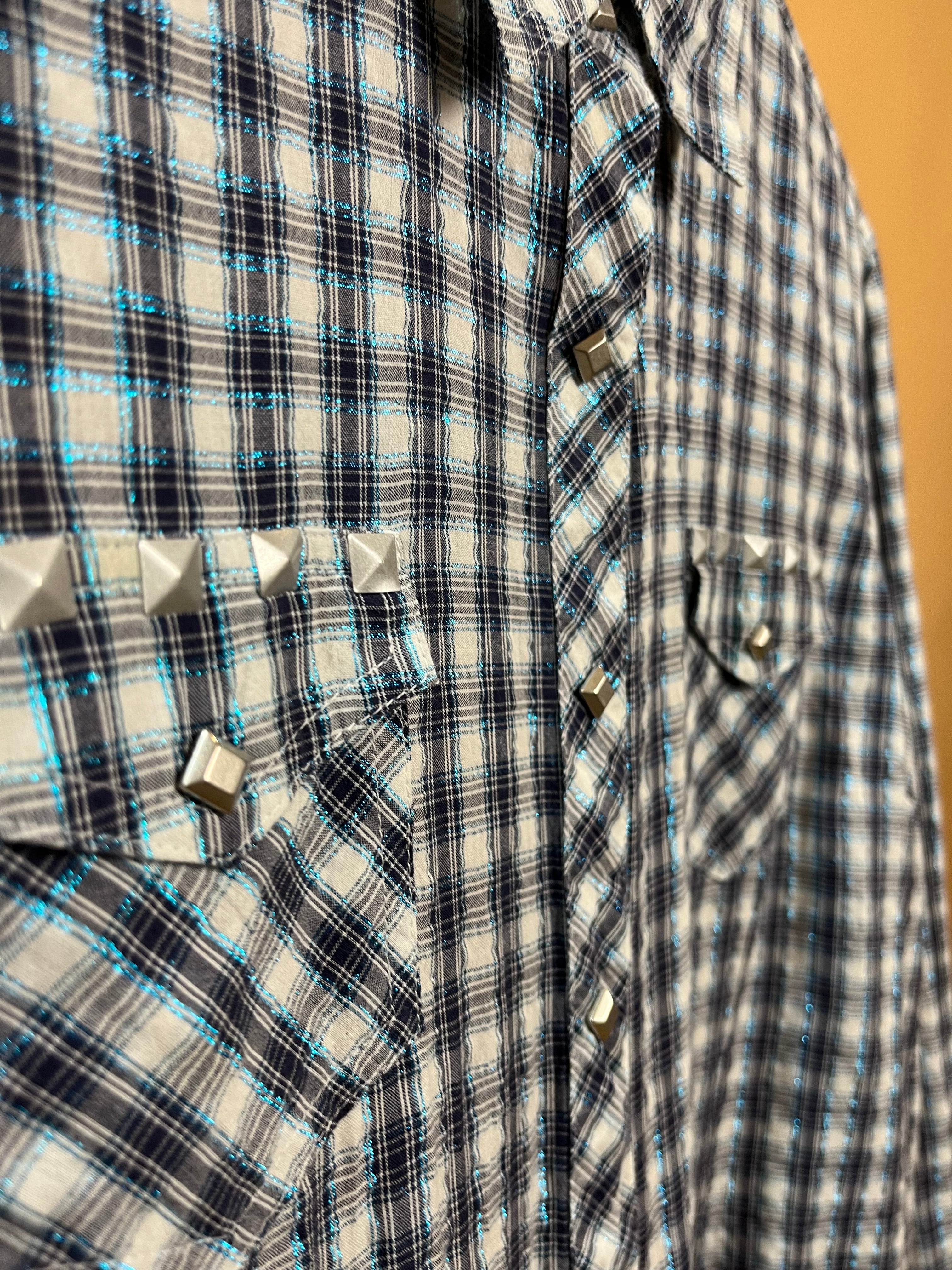 Amazing vintage 'Ariat' shirt, in excellent condition. The metallic detailing through this shirt gives it a glam vibe whilst still staying true to its western charm. It has an embroidered cross on the back, and studded snap close buttons.
