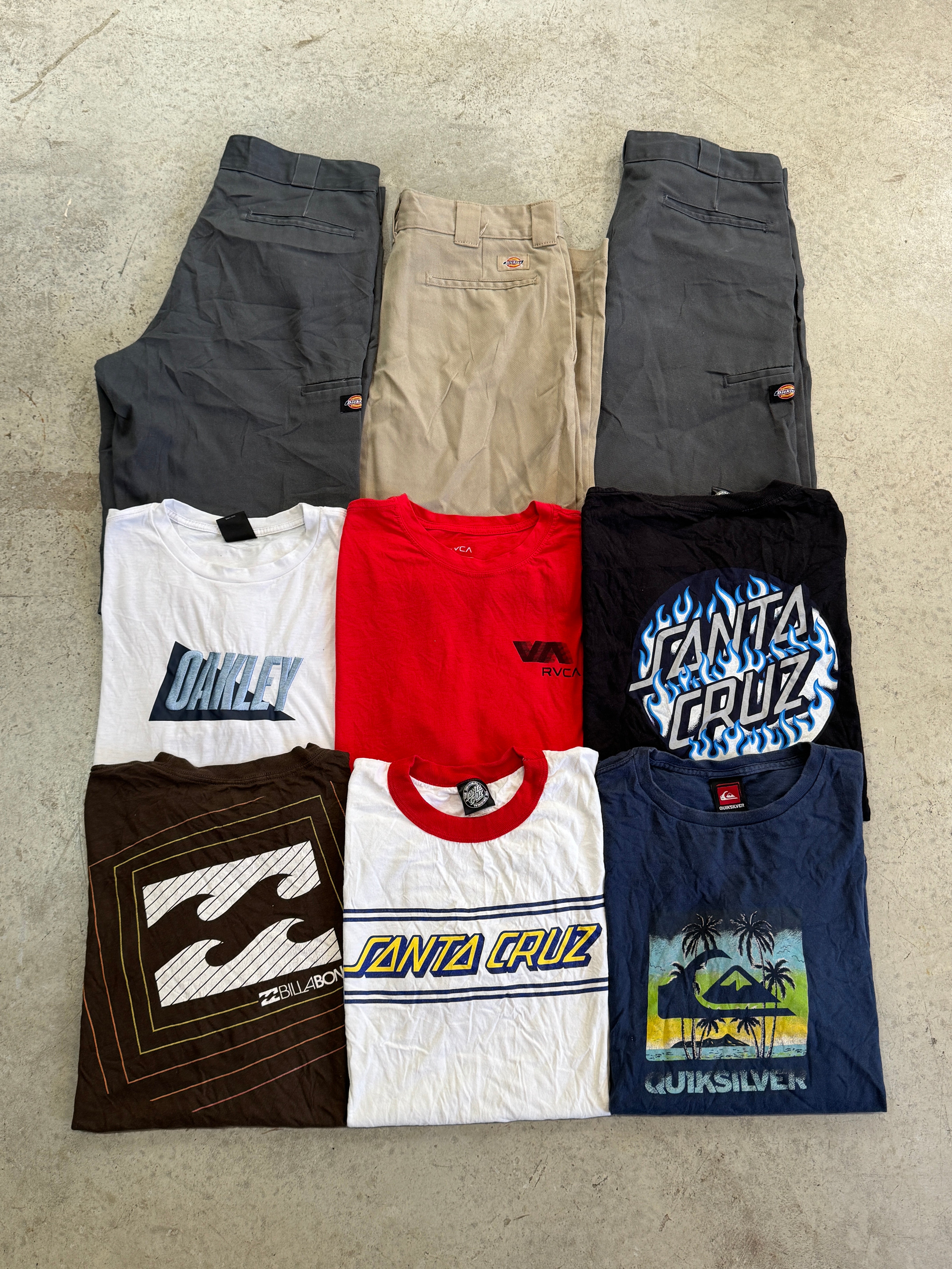 This bundle has a variety of sizes and iconic surf/skate brands including Dickies, Quicksilver, Santa Cruz, Billabong, Oakley and RVCA.