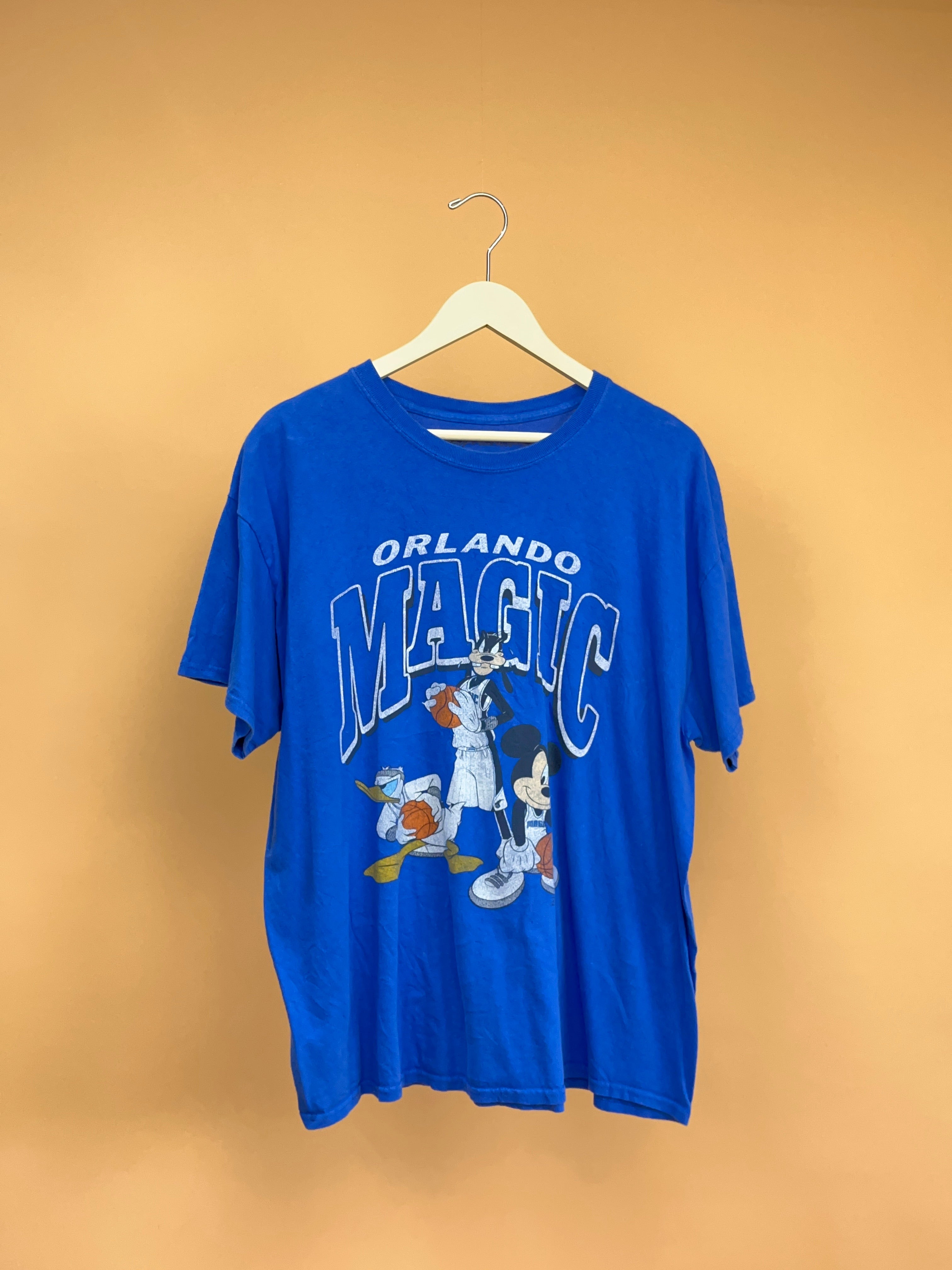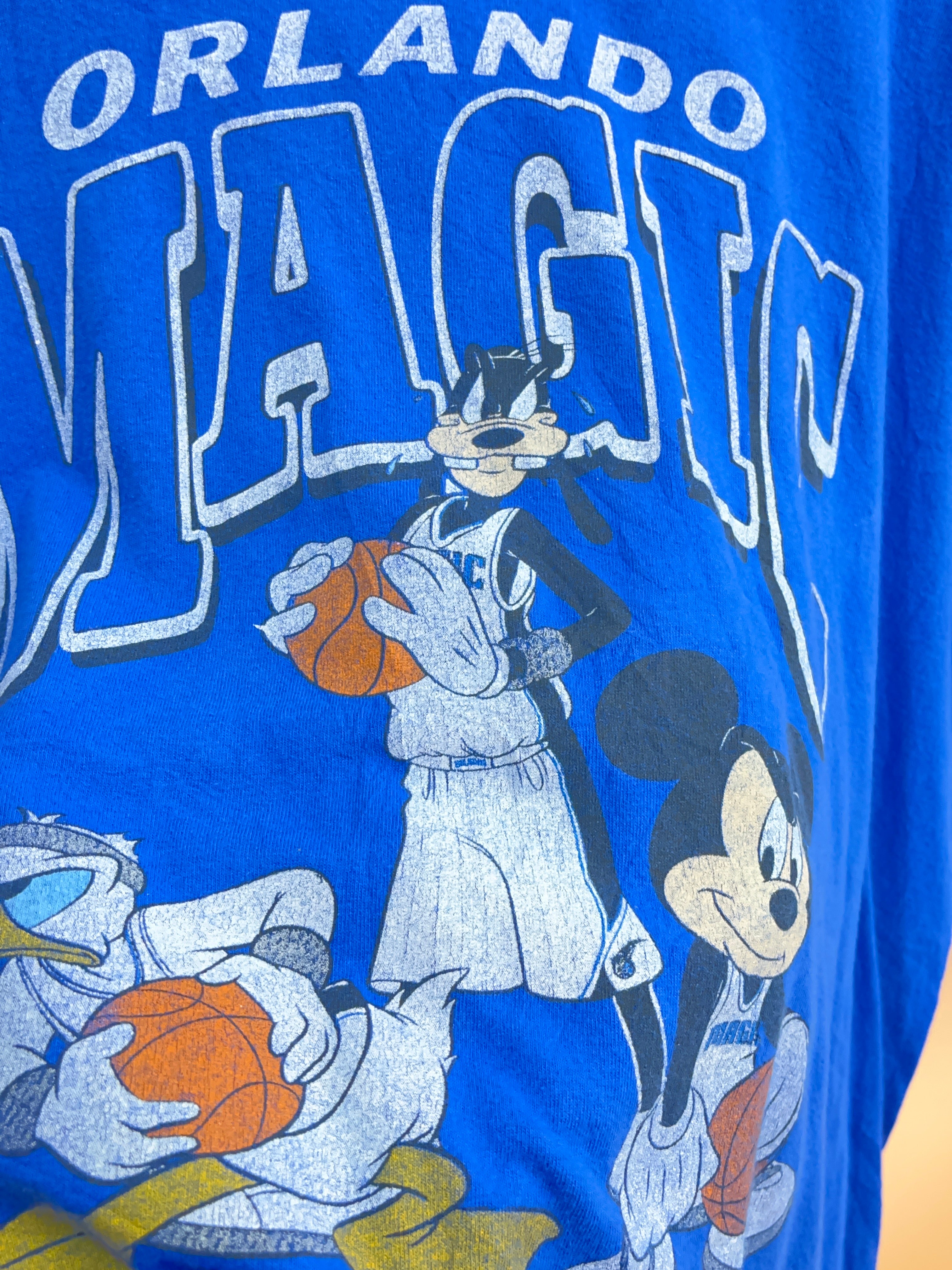 This is a mint vintage condition blue Orlando Magic t-shirt. Officially licensed NBA X Disney collab. The graphic on this is gently and authentically cracked, has no side seams, and quality double stitching on the sleeves and hem.